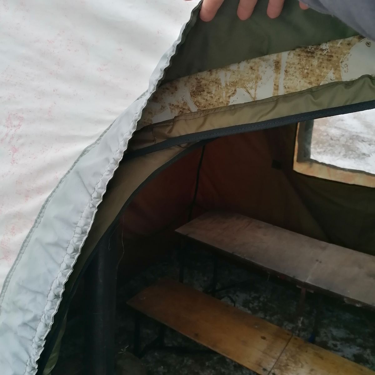 Всем привет! Сегодня испытал внутренний тент на мб-15 из оксфорда с мини КЦ-4, взял бы больше печь, но меня отпустили только с дочерью, так что пришлось под нее подстраиваться. Немного о тенте, тент сшит из оксфорда, цвет темно зеленый(лучше из белого), поэтому в палатке очень темно, спасает только окошко. Дверной узел имеет систему соединения с внешним тентом через пришитый карман, то есть в этот карман вставляется дуга, и между карманом с дугой и тентом внутренним вставляется тент от мб-15, если делать внешний тент с такой системой то будем мега надежно и быстро в монтаже, при этом между внутренним и внешним тентом остается герметичная прослойка. В дверь сделан вкладыш с изолоном 5мм. Так вот, скажу что все работает отлично, при -2 за бортом, мини кц-4 сделала достойную баню, если взял кц-4, то сидеть было бы тяжело, ну а паробомба унизит любого до уровня пола. вот немного фото и видео. завтра поеду с мужиками тестить с паробомбой. а ну да на видео я сказал что на моей мб-15 нет петельки под резинку, есть плохо смотрел. Да самое важное такой внутренний тент
