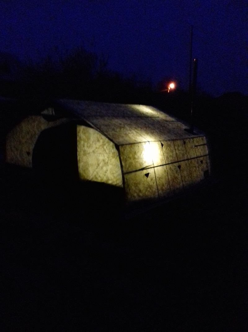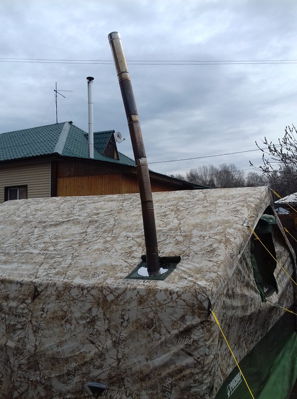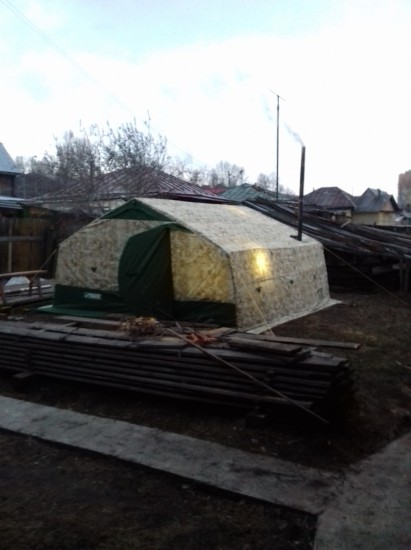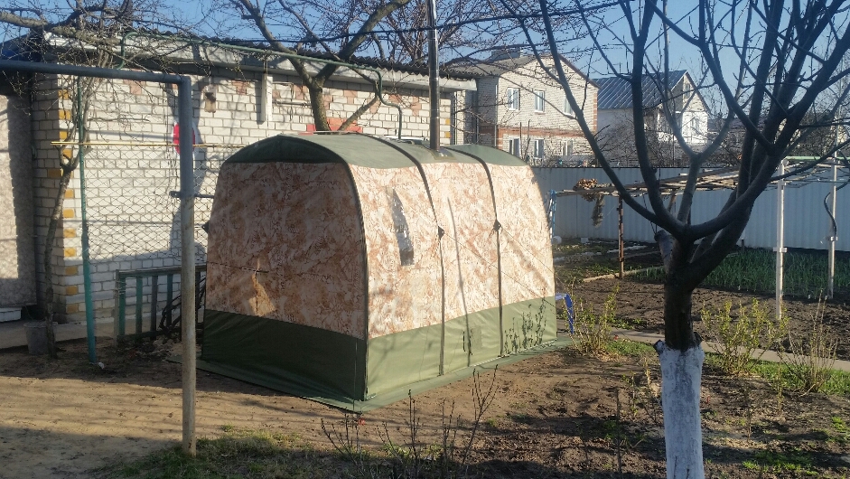 Поставил мб 103 прям возле стационара. Зима пыталась испугать нас, пытаясь свернуть ураганным ветром баню, но колышки от Бахыта держали ее намертво. Порой погода менялась и начинался ливень. Но нас этим не напугаешь.