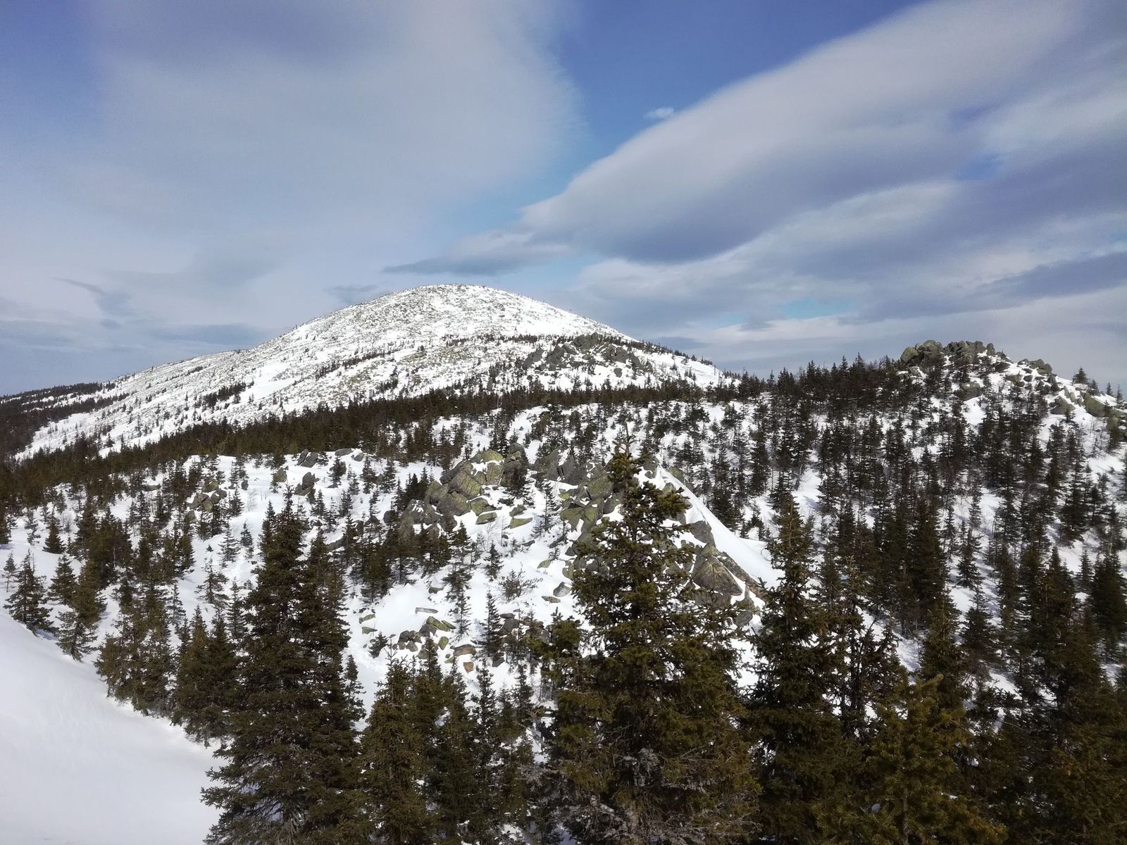 Оставив рюкзаки под елочкой, забрались на край "Откликного гребня", до куда была протоптана тропа. Из-за гребня дул холодный ветер и мы по быстрому осмотрев окрестности сфотографировались на фоне горы "Круглица". Наш путь шел к ней и она была все ближе.