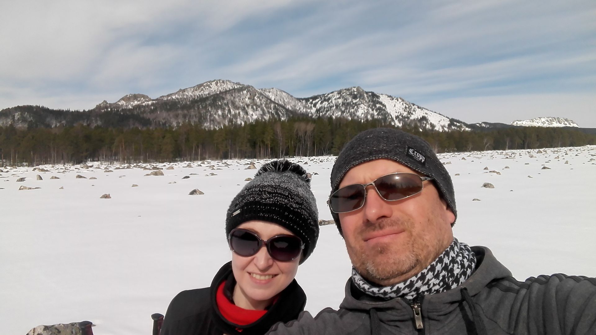 Побродив у "Трех братьев", устроили импровизированный пикник. Погода начала немного портится, налетели тучи и мы с радостью водрузив рюкзаки-грелки на спину, двинулись дальше. Переночевав в приюте "Таганай" мы пошли по нижней тропе на выход из парка. По пути посмотрели на "Большую каменную реку", но зимой она не так величественна, потому как занесена снегом.
