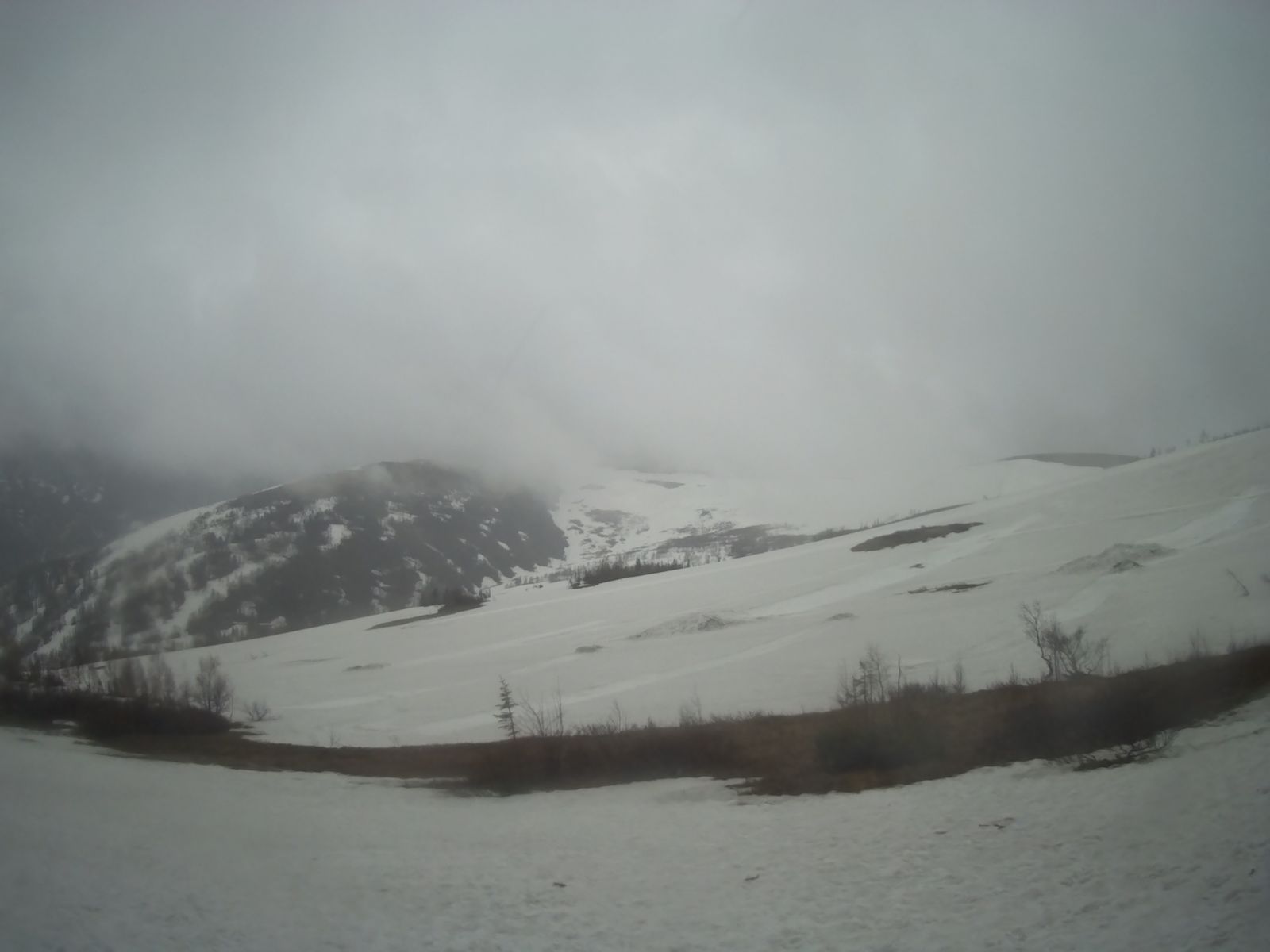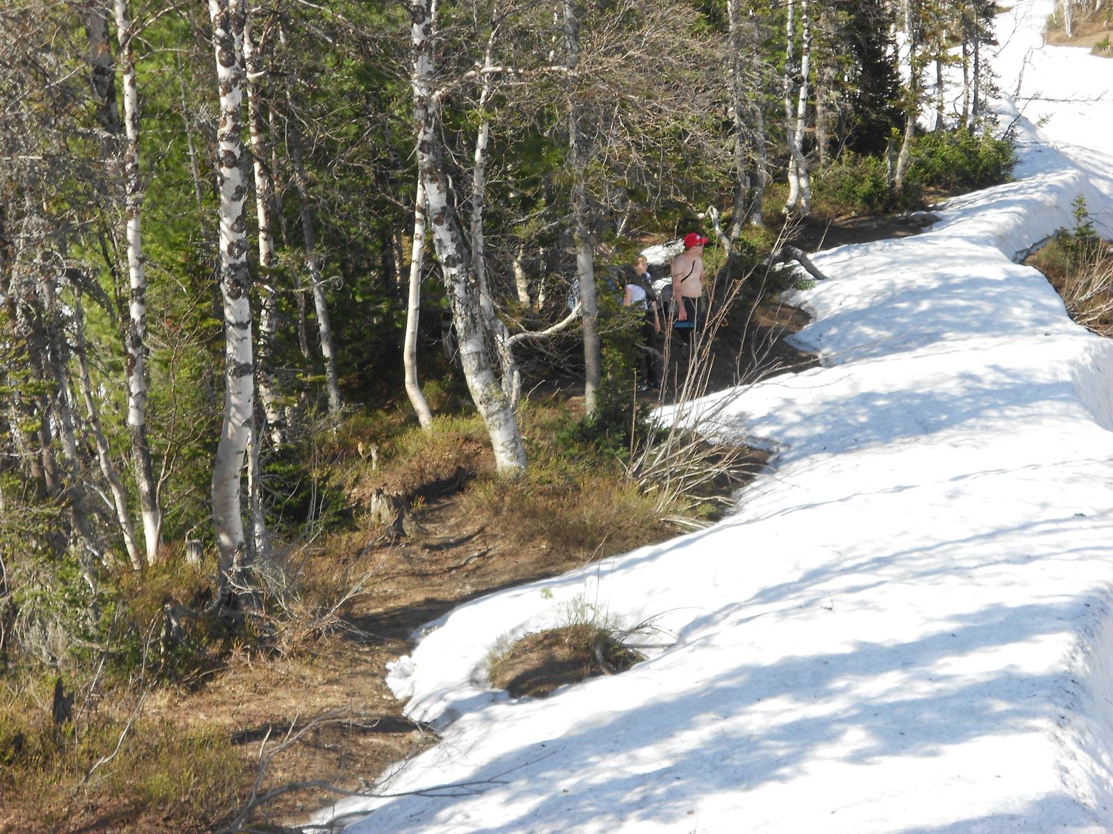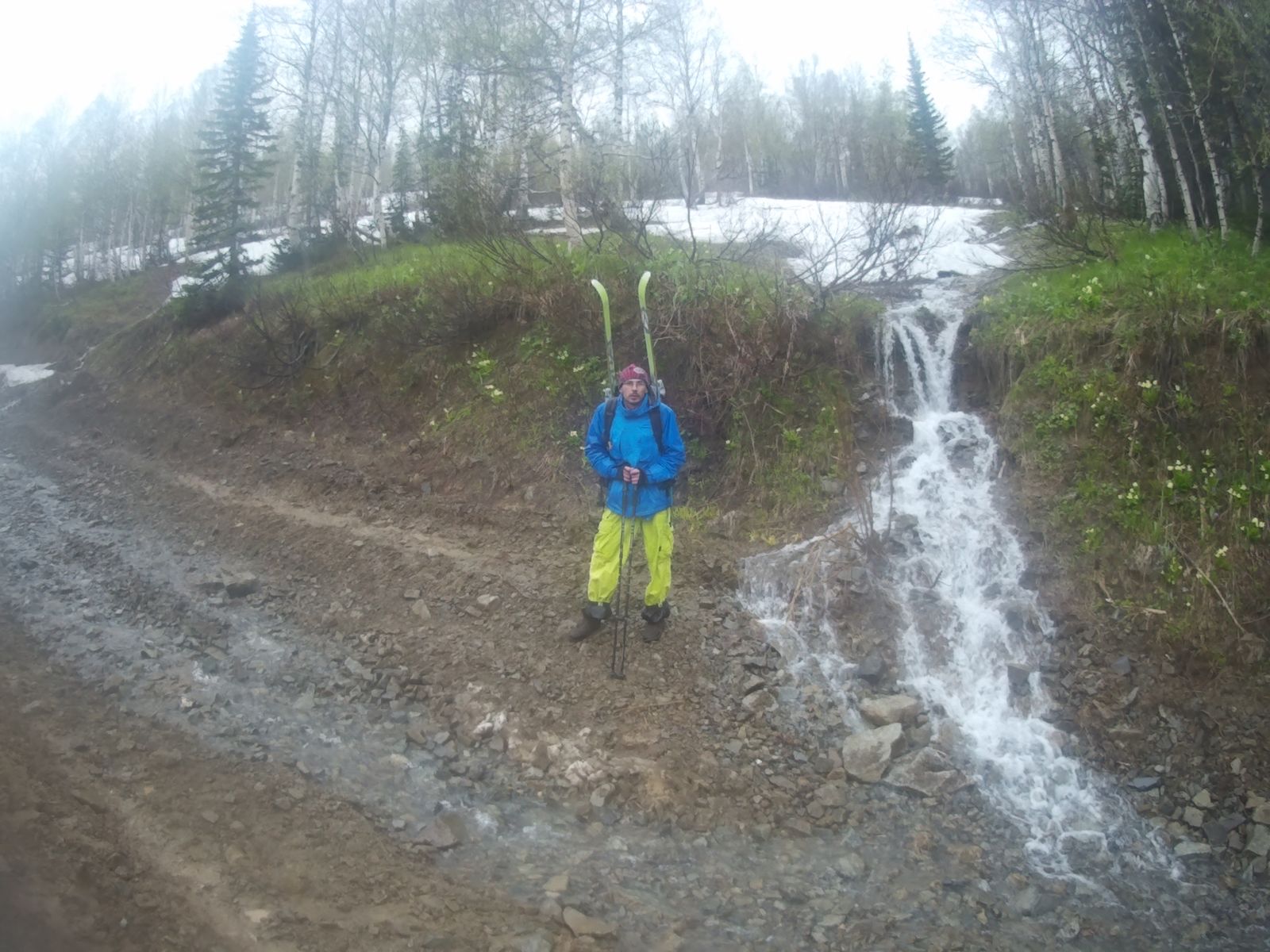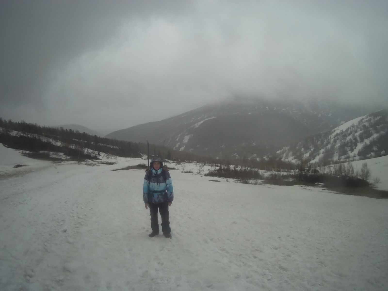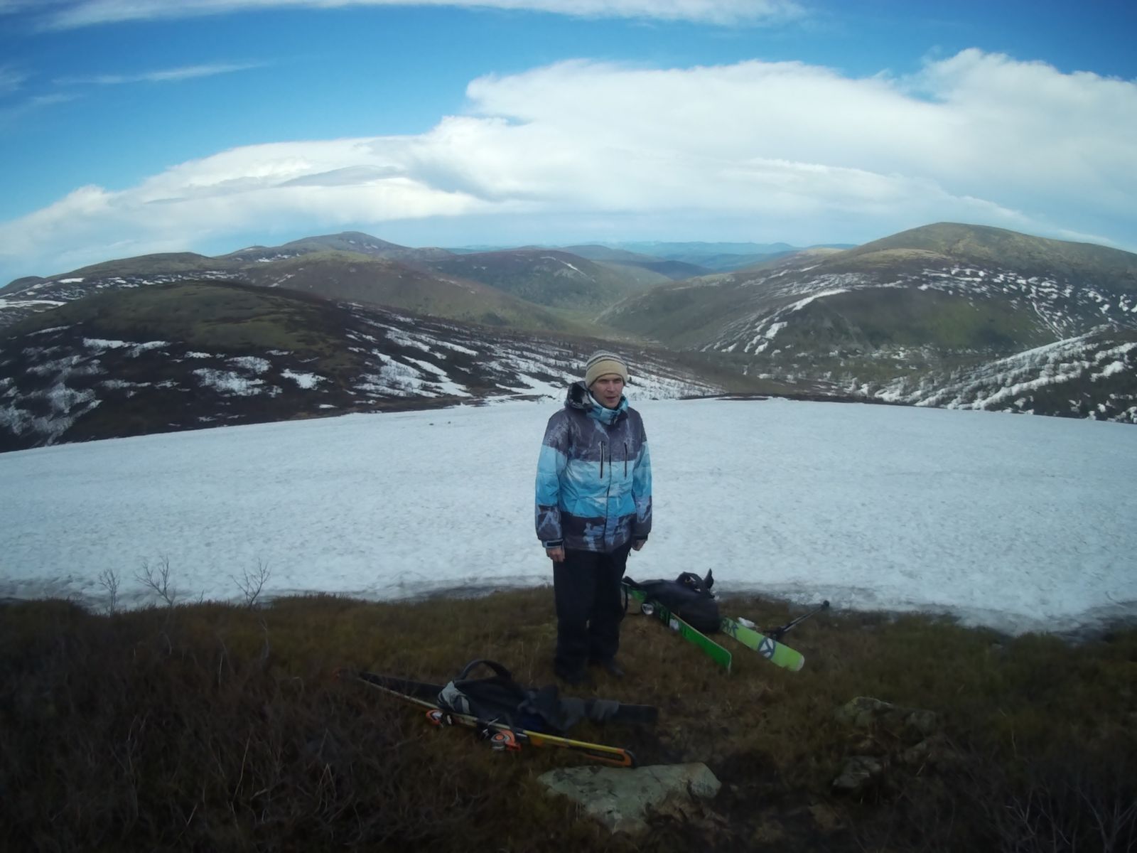 Предложение "а не одеть ли нам лыжи и вниз, что я там на верху не видел?" все чаще и чаще поступало от Ивана. Он там первый раз. Да и вообще у него много что в эту поездку было в первый раз, и ночевка в палатке, и отсутствие сотовой связи, (забегая в перед)и баня с купанием в горном руче. После нескольких матерных и убедительных слов с моей стороны в его адрес до вершины оставшиеся 2-2,5 часа шли молча. Кто-то шел и карил себя что лошара забыл термос с горячим чаем, а кто-то что связался вообще с нами.Выйдя на вершину, погода наградила нас за нашу упертость Полюбовавшись видами съев в сухомятку шоколадку, встегиваемся в лыжи и вниз. Подьем-спуск занял 5часов 20 минут.