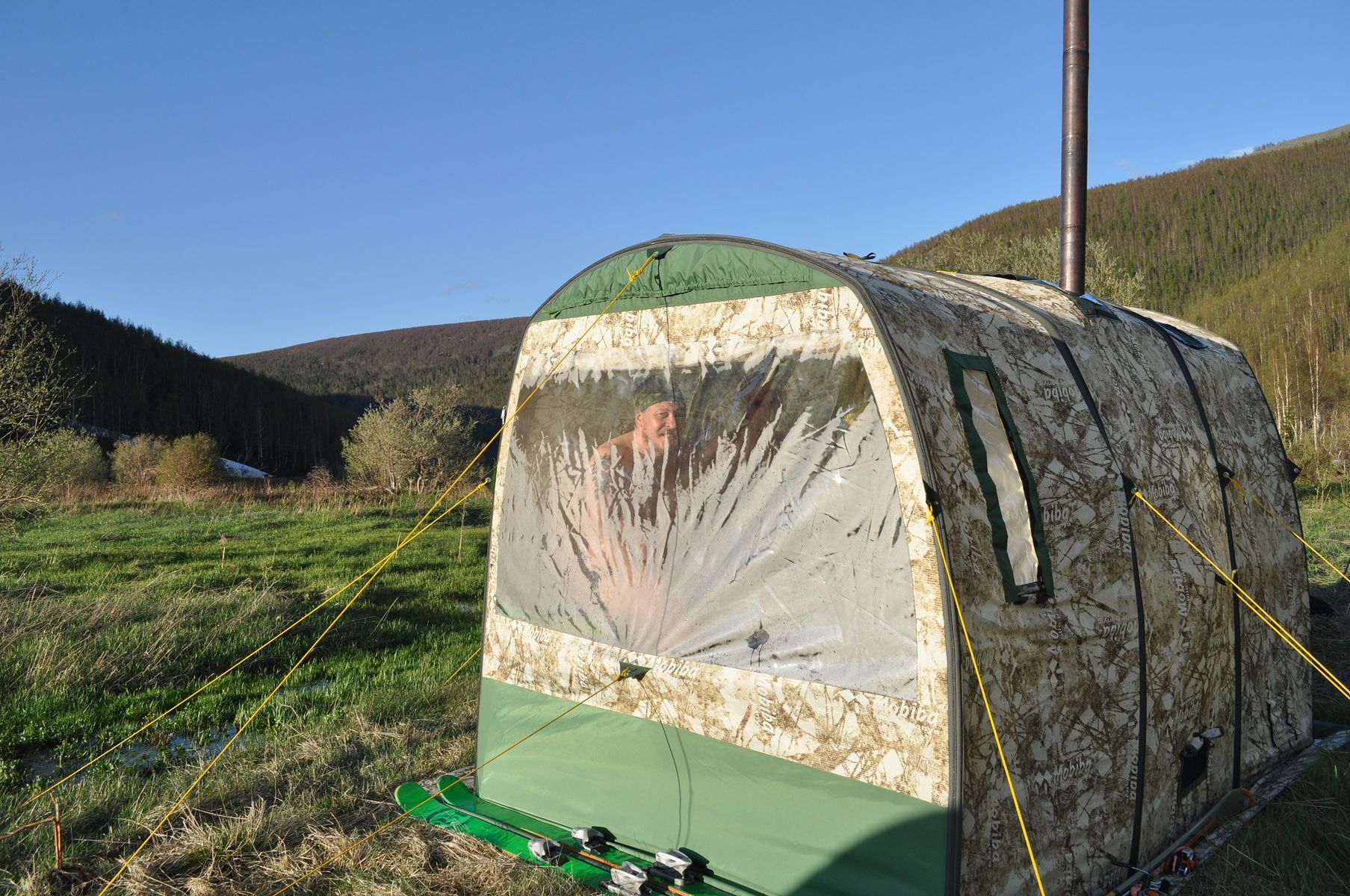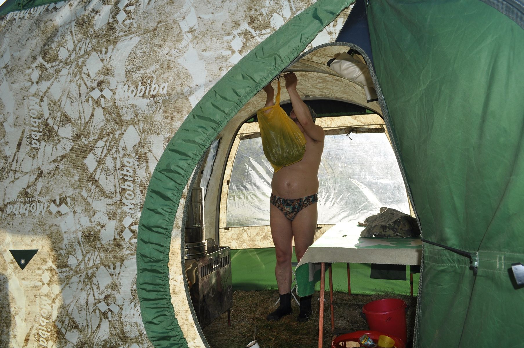 Немного отдохнув начали заниматься баней. Решили попробовать МБ-103 без перегородки. Печь Ультра с Парофоном и на подножном корме не смогли нагнать нужной температуры. Застегиваем перегородку и вот оно счастье... Парились до темноты, после вынесли полок на его место столик, и под шум реки сидели пили чай вели неспешную беседу. А если честно мы больше ржали над Ванькой как он делился своими мыслями и впечатлениями, как он еще пол дня назад проклинал что поехал, а сейчас после баньки как заново родился и полон сил...