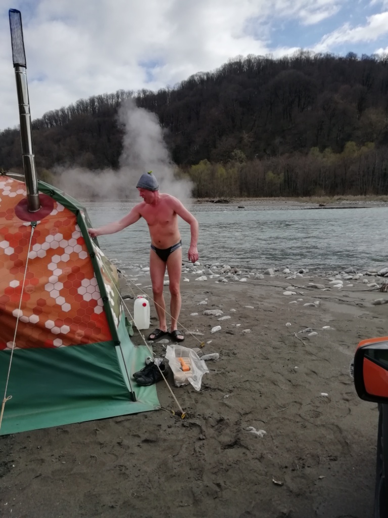 Наконец появилась возможность испытать долгожданную Кайфандру, заранее купленную еще в феврале, чтобы точно не пролететь с поставками к майским праздникам. Сходили на Волгу париться и купаться среди льдин.