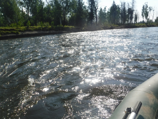 Остановка на ночлег после первого дня на нашем бывшем песчаном пляже, от которого не осталось и следа. Поставили десятку, растопили Согру и нормально без натяжек попарились. 80-85 градусов нам хватило. Только надо отметить, что Согра не разгоняется на речных голышах до нормальной температуры, поэтому мы взяли с собой три камушка Жадеита.