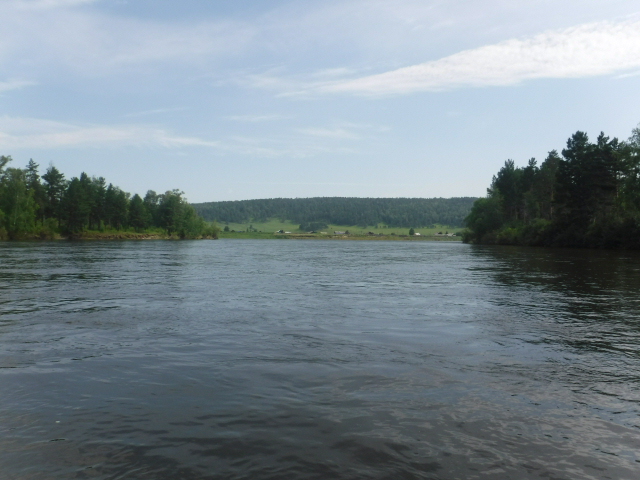 День второй. Мы очень уважаем нашу реку, поэтому, даже если надо по-маленькому, причаливаем к берегу. Деревня Тюмень с воды. На второй день у нас начались "сюрпризы". Сначала мы потеряли спиннинг, вернее не потеряли, а но, зацепившись настроем за топляк, просто выстрелил из лодки. Найти его на течении в мутной воде не получилось. Затем умер аккум от электромотора, и нам представилась перспектива 6 часов чапать вёслами до места прибытия за нами авто. Но тут к нам подплыли ребята и предложили помощь. Парни представились зелёными, но были слегка "синие", но это не помешало нам в дружной компании проделать оставшийся путь на прицепе. Мы переместились в их лодку, а мой Марлин прицепили на трос. Их СИАПРО 40 сил этого почти не почувствовал. Столько спиннингов, настроев, мушек, блёсен, мышей и т.д. я никогда за раз в одной лодке не видел, однако результат у ребят был тот же - рыбы ноль. Наш Марлин290 с крошечным Ватерснейком и Абакан 420 с Сиа-Про 40. Парни шутили, что мне никто не поверит, что моя лодочка смело выходит на глисс.