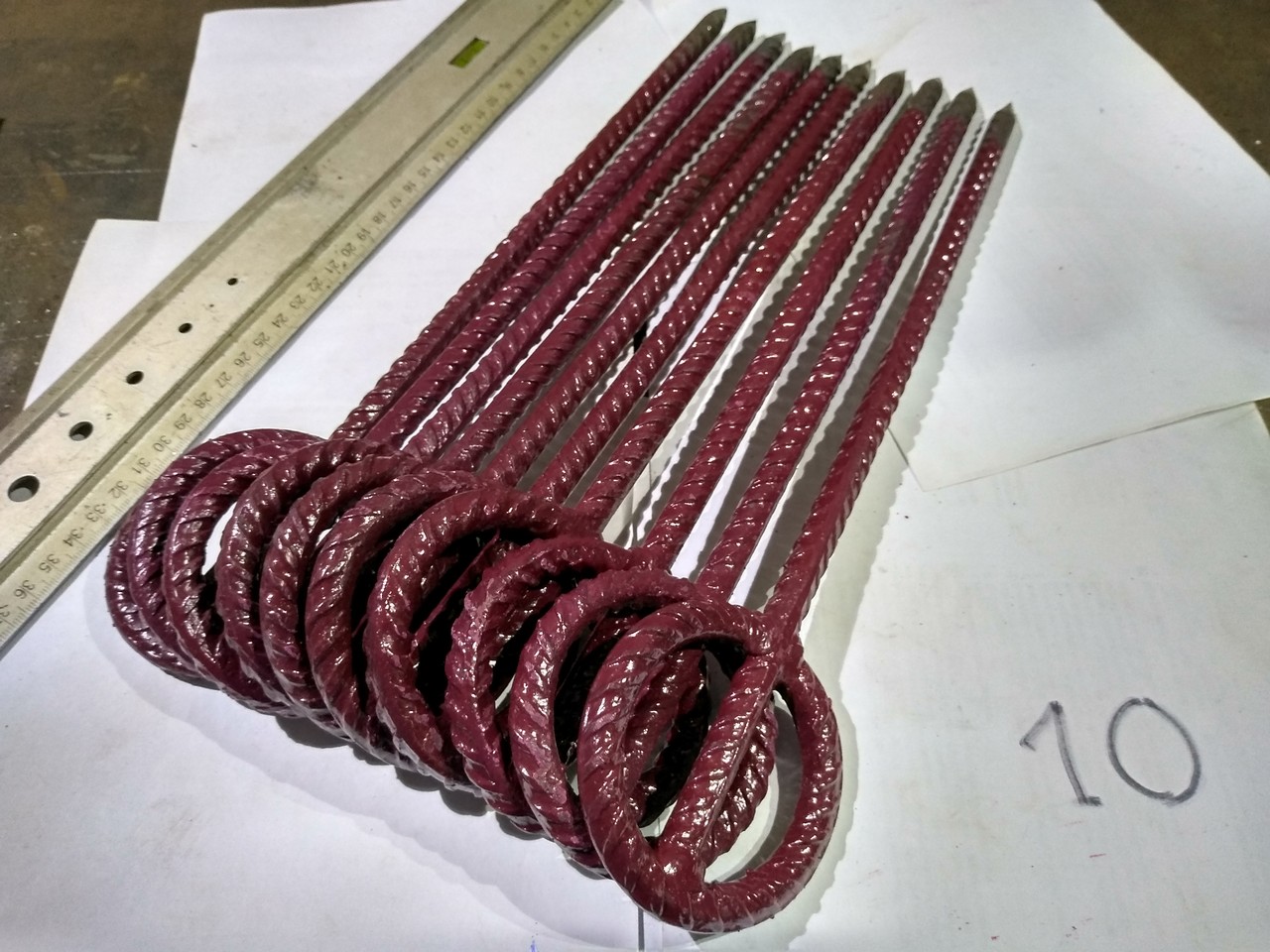 Предлагаются колышки, изготовленных по пожеланию заказчика, из 6, 8 и 10 арматуры. Длина, как показывает практика, достаточна и составляет 35 см. Фото будут предоставлены ниже.