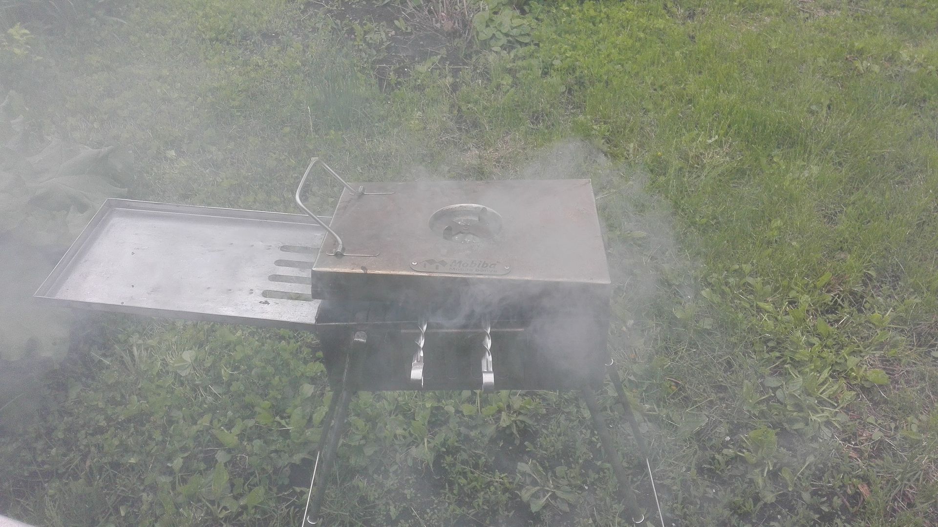 Когда угли разгорелись, ставим мясо: Готовится все как всегда быстро: После мясо жарим форель: Закрываем крышкой: Пока готовится рыба, мясо уплетается за обе щеки: Тем временем, Мангал выдает себя дымком: И вот форель готова: Вид на полянке: