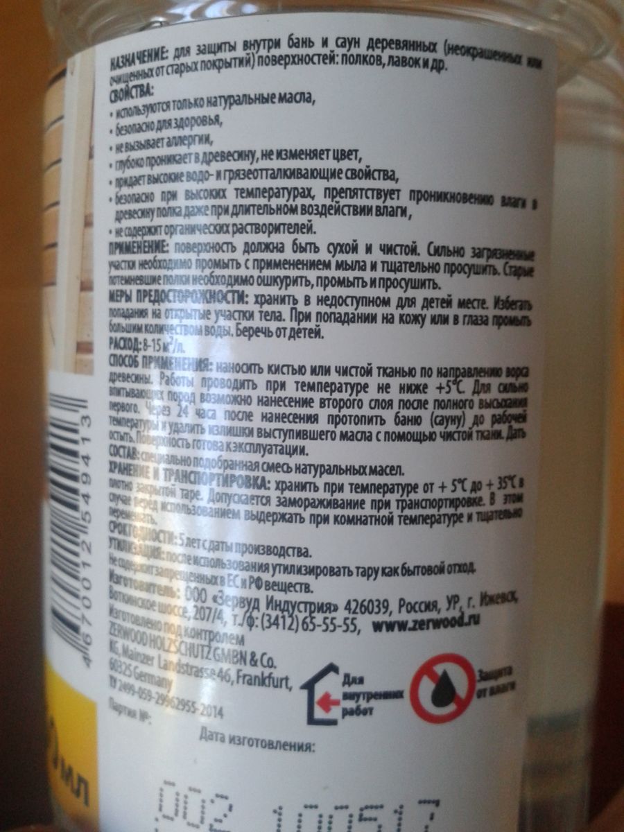 Пропитка бесцветная, финская, специальная для полков в сауне.