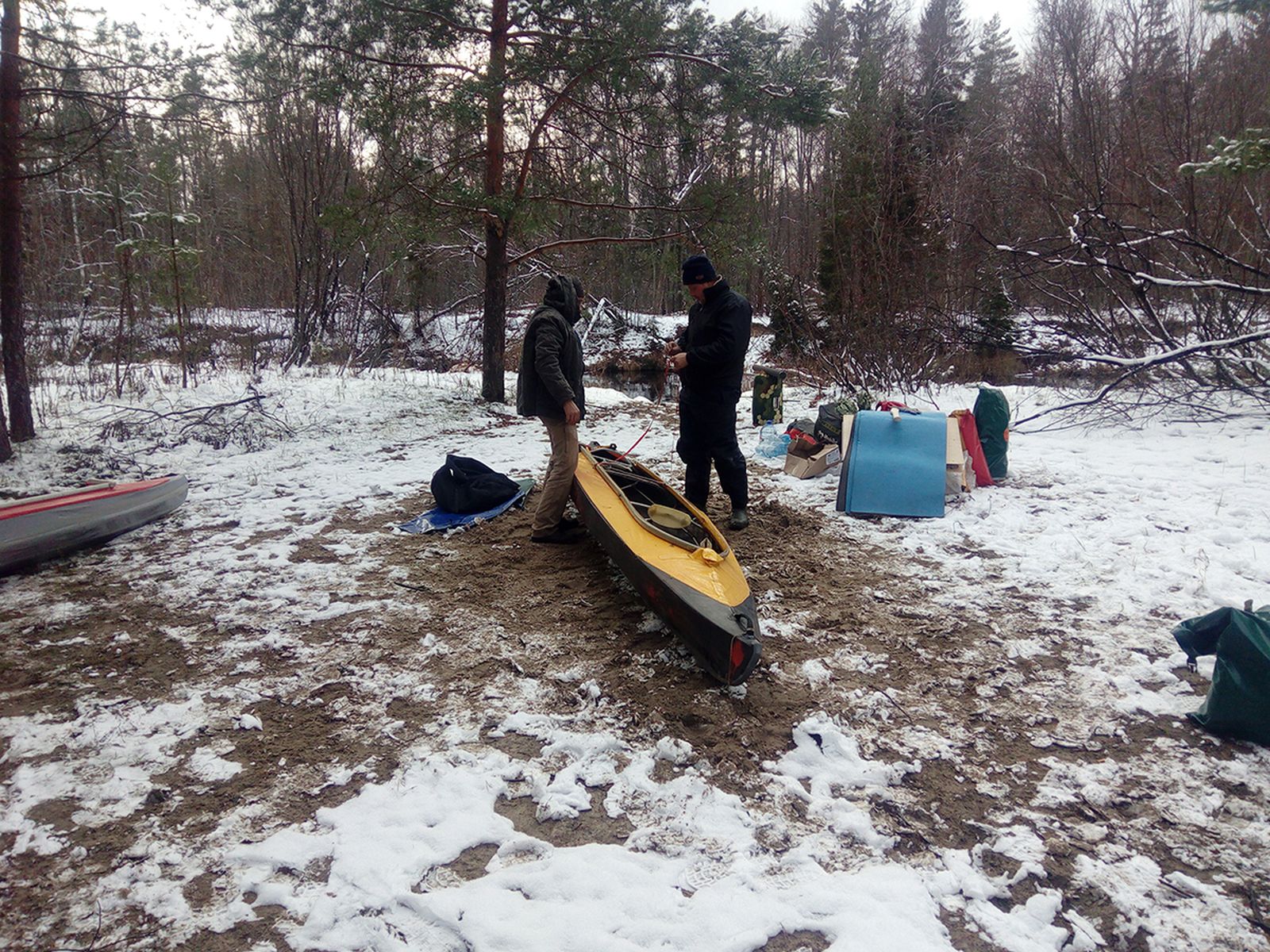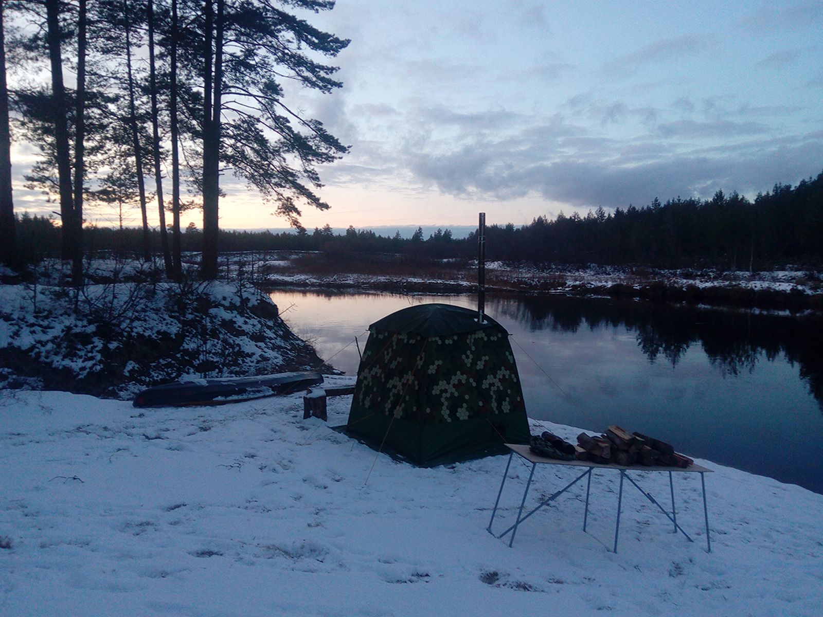 В этот раз на стоянке сначала поставили Пятнашку, сбегали за дровами, а потом, уже в сумерках и Десятку. На костер забили, готовили на Согре. Пятнашка с Согрой давали такой запас тепла, что выходили на улицу зачем-либо без верхней одежды. И банная вакханалия повторилась.)) Снег сначала начал сыпать с дождем, ночью перешел в чистый дождь. И к утру почти весь снег съело, как и не было. Юбку у жилой палатки, чтобы не прикапывать, приваливали с наветренной стороны ненужными «запасными» вещами в гермах. Во вторую ночь Согру прикрывали чуть больше, подкидывали через 4-4.5 часа. Что касается мобильности Мобибы. В байдарку Таймень-2 легко помещается весь банный арсенал, перечисленный выше, личные вещи и продукты, запасная палатка, тент 4х6(на всякий случай))), бензопила. При этом остается еще много свободного места под бортами. А сама байдарка остается легко управляемой. Да, все это при одном пассажире. Напоследок вопрос: друзья, а Мобибавирус лечится?)