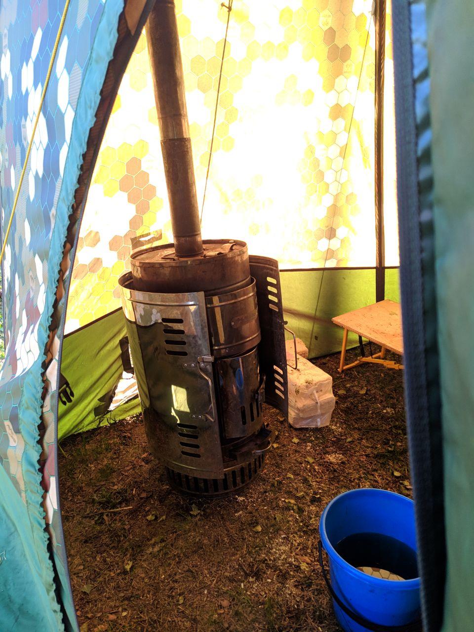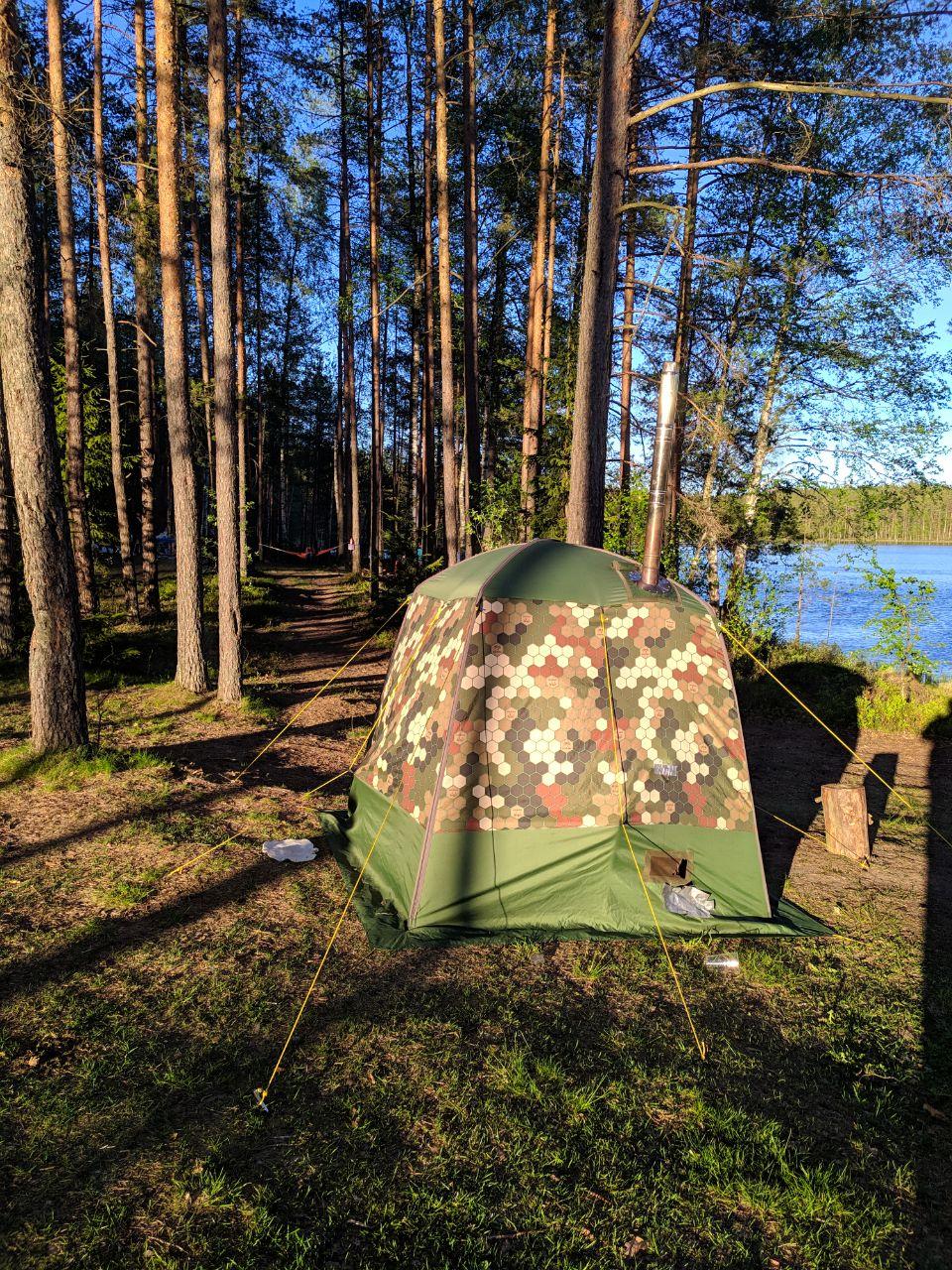 Долгожданная суббота и мы на карьере, народу никого, легкий ветерок. Ставлю палатку - она огромна после МБ-10, минут 5 не мог понять как вставить каркас в дверь, у десятки на молнии. Ставлю печь, вода, брикеты, затопляю, пока изобретали лавки вода закипела, тяга пошла, доливаю, снова закипела, минут 15 подождали и пошли париться.