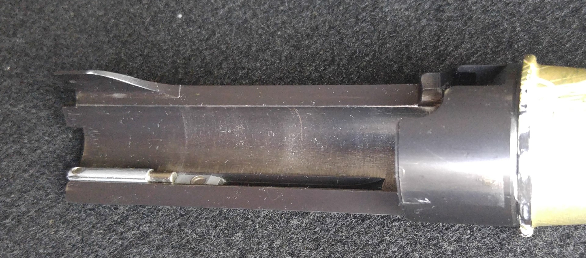 Эта 8ка была в печальном состоянии. Он обрезал ей приклад, выпилил углубление под палец, спилил мушку и переделал УСМ; кроме этого с чисткой он тоже не заморачивался. Мне пришлось приложить немало усилий, чтобы восстановить дерево и все вычистить; настрел мы с ним оценили в 100,000 выстрелов. Антабку уже врезал я, в оригинале ее не было.