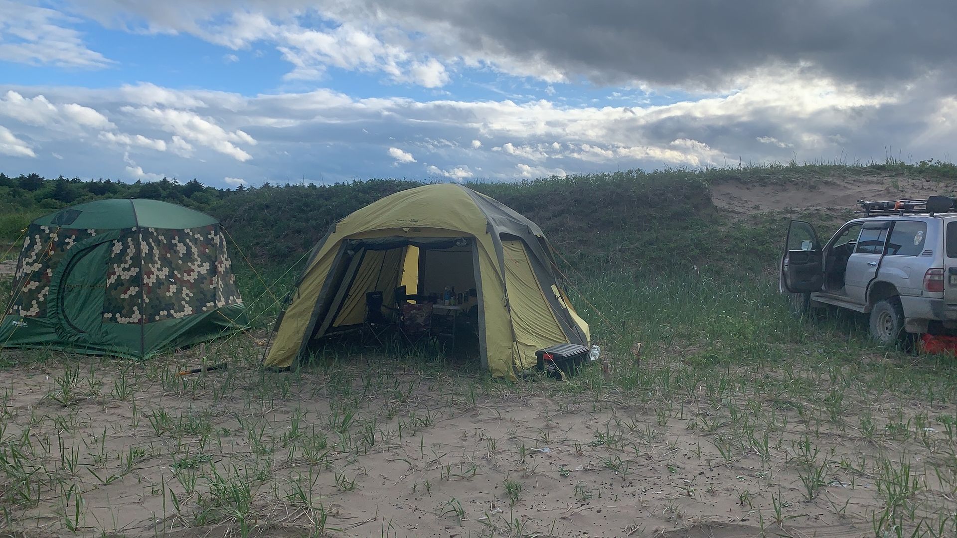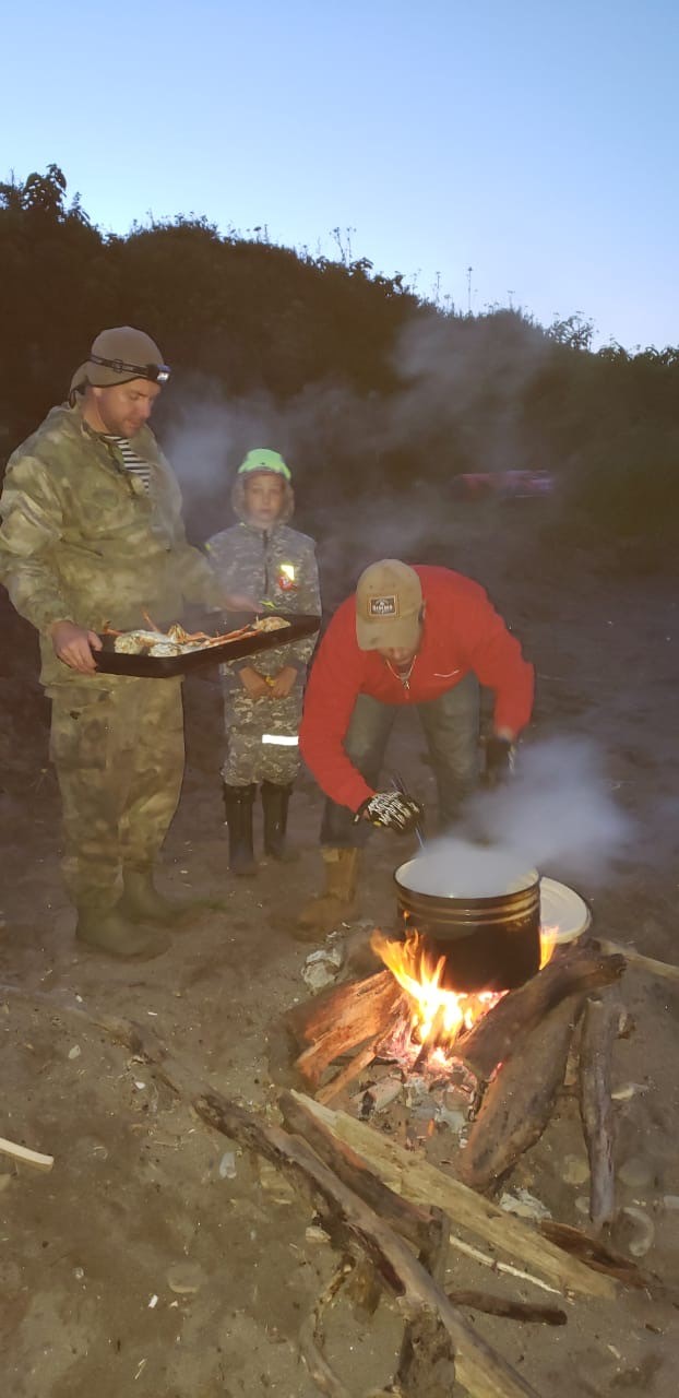 Выехали в субботу вечером и встали лагерем на берегу. Баню не брали, а использовали М-15 в качестве спальной палатки. Вышли в воскресенье утром и встали на нашу проверенную банку, где всегда ловим камбалу.