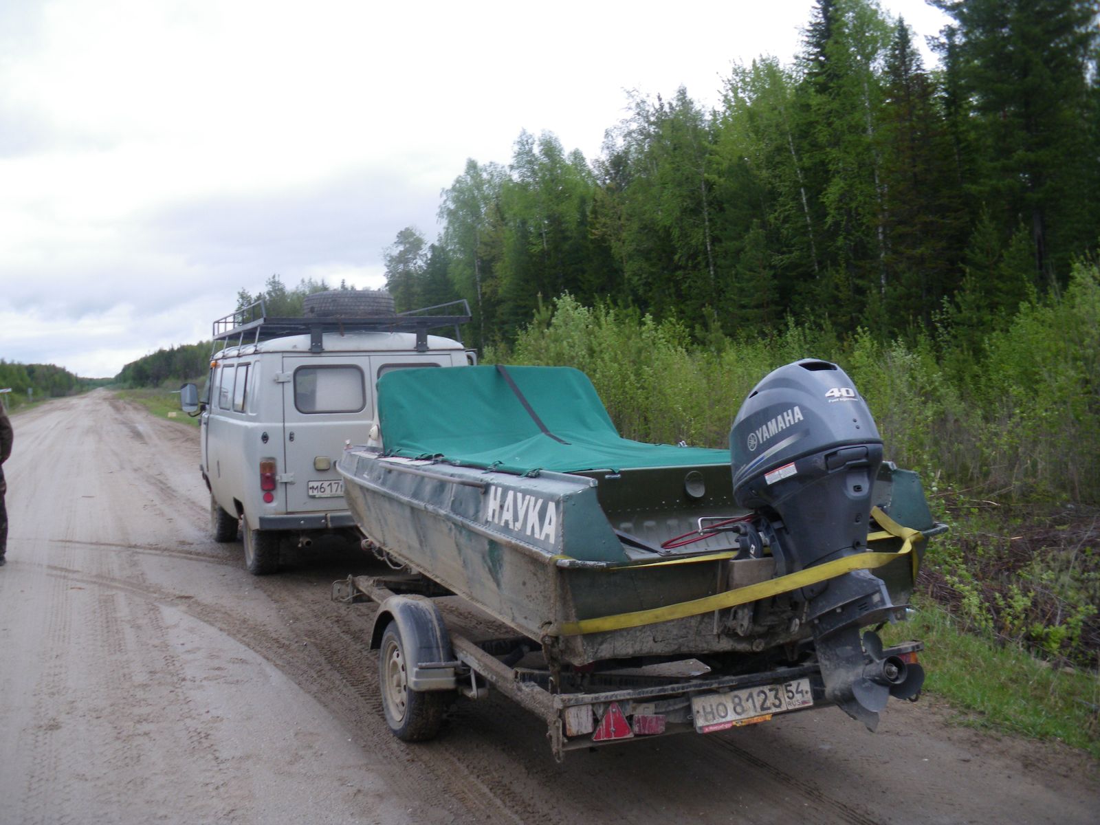 Ехать в один конец нам было около 400 км, а поскольку это Сибирь и весна, то без лодки (а зимой - снегохода) у нас добраться куда-либо совершенно нереально, тащили с собой еще и лодку на прицепе. Вот где-то примерно между 1/3 и 1/2 обратной дороги (эталонно отвратительной) на прицепе развалился ступичный подшипник. Ну а дальше - классика: резкий толчок, скрежет, сашино "б...дь!!!" и обгоняющее машину колесо. Разумеется, запасной ступицы или подшипника у нас с собой не оказалось, пришлось искать. Ближайшая деревня - 20 верст, но там нет ни автомагазина (купить), ни знакомых (попросить/занять) нужную деталь. Да и мало какой деревенский автомагазин будет работать в 6 вечера в субботу. В итоге мы решили, что поедем по деревням искать запчасть, а лодку бросим на дороге. Но лодка - вещь казенная, цены немалой, поэтому пришлось оставить с ней Штурмана.