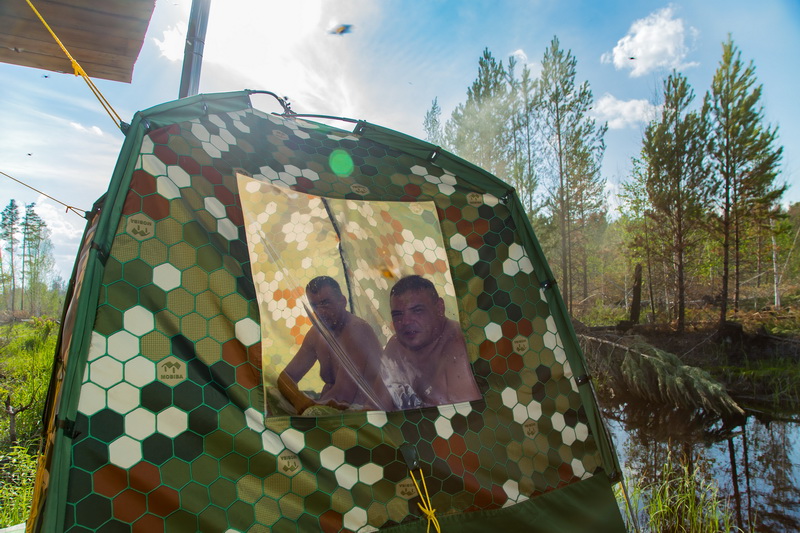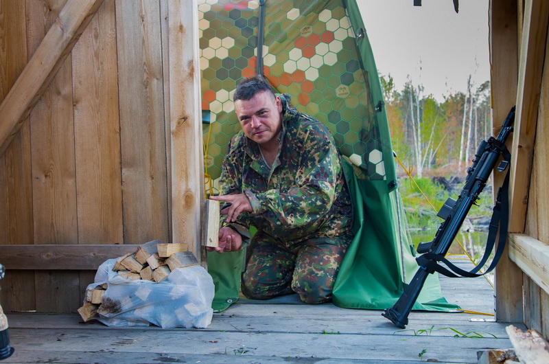 Быстро проводим субботник по расчистке и уборке территории и разворачиваем лагерь. Получается симпатиШно и живописно. Все-таки «Мобиба» - это не только удобно и практично, но еще и украшение любого лагеря, стана или базы! Обратите внимание на то, как работает фирменный и сотовый камуфляж.