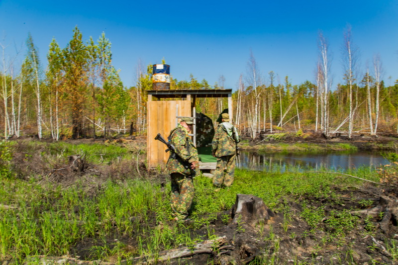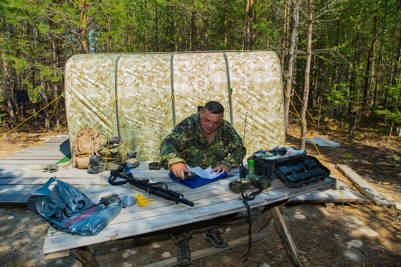 В прошлом году мы уходили отсюда из-под пожара, пришлось спешно эвакуировать снаряжение, технику и людей, поэтому я ожидаю увидеть только сгоревший лес, золу и головешки. Но Вася, успевший сбегать туда осенью (у него промысловый участок недалеко), меня успокаивает: все строения и сооружения целы, лес тоже погорел, но не критично. Действительно, наш старый лагерь встречает нас так, как будто мы уехали отсюда неделю назад: подиумы под палатки засыпаны хвоей, мусорный бачок, который мы из-за пожара не успели выжечь, растаскан медведем, даже часть заготовленных в прошлом году дров сохранилась!