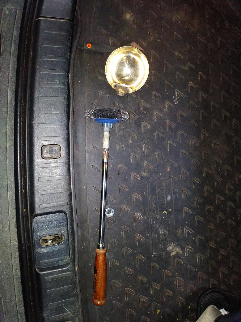 была вот такая штука развалилась на две части, ковш и ручка, к ручке приварили шпильку, к ковшу гайку - что бы можно было менять ковш на щетку.