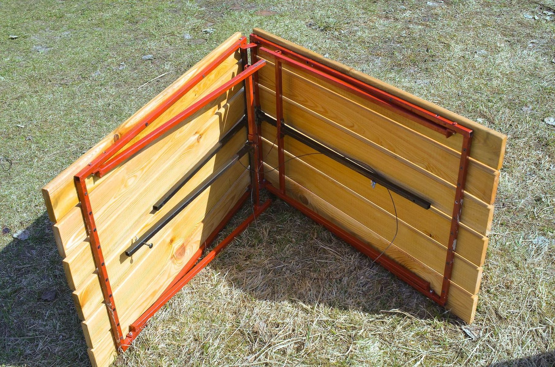 собирается за пару минут, но вот только тяжелый полок вышел просто жесть. компактный, да, но тяжеленный ужасно. взвесить нечем. В целом опыт получился интересный, но вывод для себя я сделал такой - потраченное время лучше бы по специальности подзаработал и на вырученные деньги купил фабричное изделие. Не очень-то сэкономил, а учитывая время - даже прогадал. В дальнейшем так и сделаю и закажу для большой палатки уже пару-тройку кроватей КС-350.