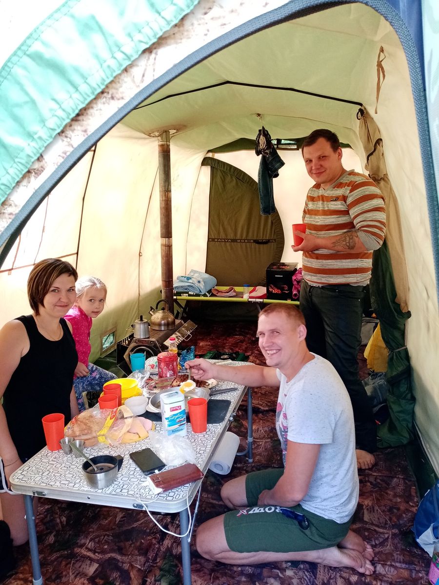 Смеркалось. К моменту нашего приезда Михаил с Татьяной уже замутили поляну и успели попариться и вроде больше не собирались. Ах да, естественно были крепкие рукопожатия, обнимашки, довольные лица и всё сопотствующее. Первый раз всё таки виделись. Город небольшой, но не доводилось, хотя с Мишей вроде попытки были. Итак. На скорую руку разбили лагерь: Артём для себя 103, мы с семьёй 442. Всё хотели помочь друг другу, но при этом понимали, что лучше не мешаться, каждый знал своё дело. У Миши, кстати, стояла МБ-15 и Инипи с КЦ-3 - знатные изделия, однако. Короче, вроде всё приготовили и .... Нет, не по рюмке крепкого чая, а в баню, в Инипи. Туда забабахали мой полок с доп.ножками и высота его стала от земли 87 см, если не изменяет память. Мишин полок такой же высоты. Ну и.... вечер начался, ночь продолжилась, утро приближалось))) Вот сейчас сдам Мотора: ну не пьёт он рюмки крепкого чая, наверное всё же к счастью.