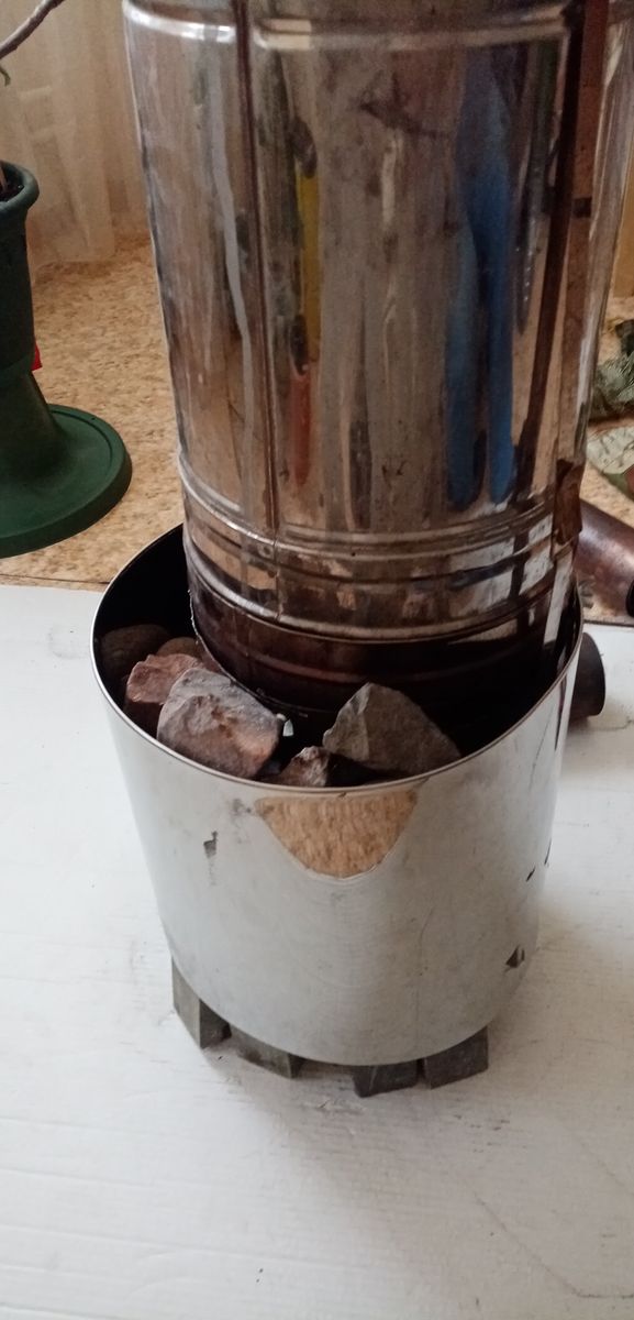 Хоть и нету гаража, но руки чешутся. Давно хотел сделать тюнинг Жиги. Много лучистого тепла просто так уходит. Конечно ни как у старших, но тоже ничего. Вместо полочки под камни, прямоугольные бруски стоя, потом уже россыпь мелких. ППГ-90 уеоротил на 2/3.