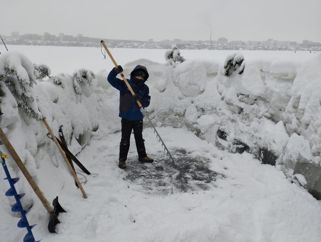 :lol: Ну всё нетак плохо получается у меня с пилой, топором правда когда столько воды на льду прорубь не сделать.