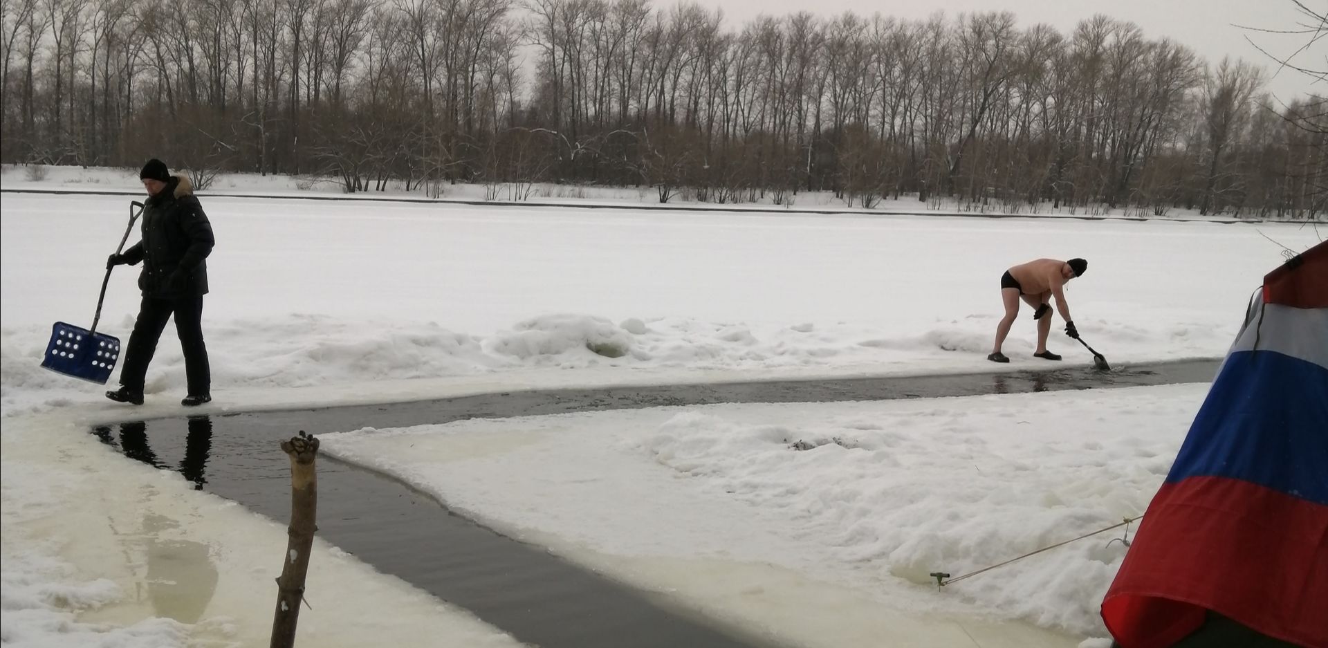 У нас сегодня тепло. Горожани активно расчищают прорубь.