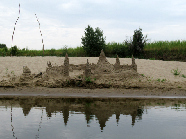 что приходилось их оплывать от одного берега к другому. Очень часто наблюдали как они брали подсаками серебряных карасей и чуть пореже сазанов, а экземпляры там не маленькие. Проходя по мелководью спугивали гревшихся таких торпед по 5-10 кг., аж байдарка ходуном. Увидели на берегу единомышленника одиночку, стоявшего на днёвке и ловившего рыбу. Пока разговаривали, случилась поклёвка и после недолгой борьбы он сказал, что без подсака не вытащит, а его у него нет. Достал свой, который только для этого и пригодился, а потом ещё пришлось доставать эл. весы. Вес оказался 6,28 кг. Нам презентовал икру. Проплывая по одной из ям, рядом начала всплывать «подводная лодка» и медленно показывать свой бок. В этом момент мысль была одна: хоть-бы не ударил хвостом - обошлось. На глаз вес сома был более 25 кг Судак по рассказам ловился и мелкий по 0,5 кг, и средний попадался по 2-3 кг. Видели поимку берша в районе кило. Щука в этом году ловилась мелкая, в среднем грамм по 300, практически всю отпускал, но попадалась и на еду. Окунь в нескольких местах просто порадовал: заброс – окунь, заброс – окунь, примерно за час почти 7 кг