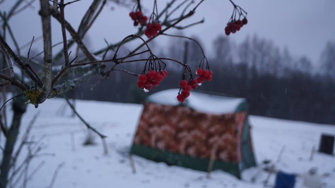 Погода была неоднозначная. По началу настоящая зима с трескучими морозами и ночными температурами -29. А последние 2 дня ночью резко потеплело до +4 и потекло... Баню сворачивали уже почти по колено в воде.