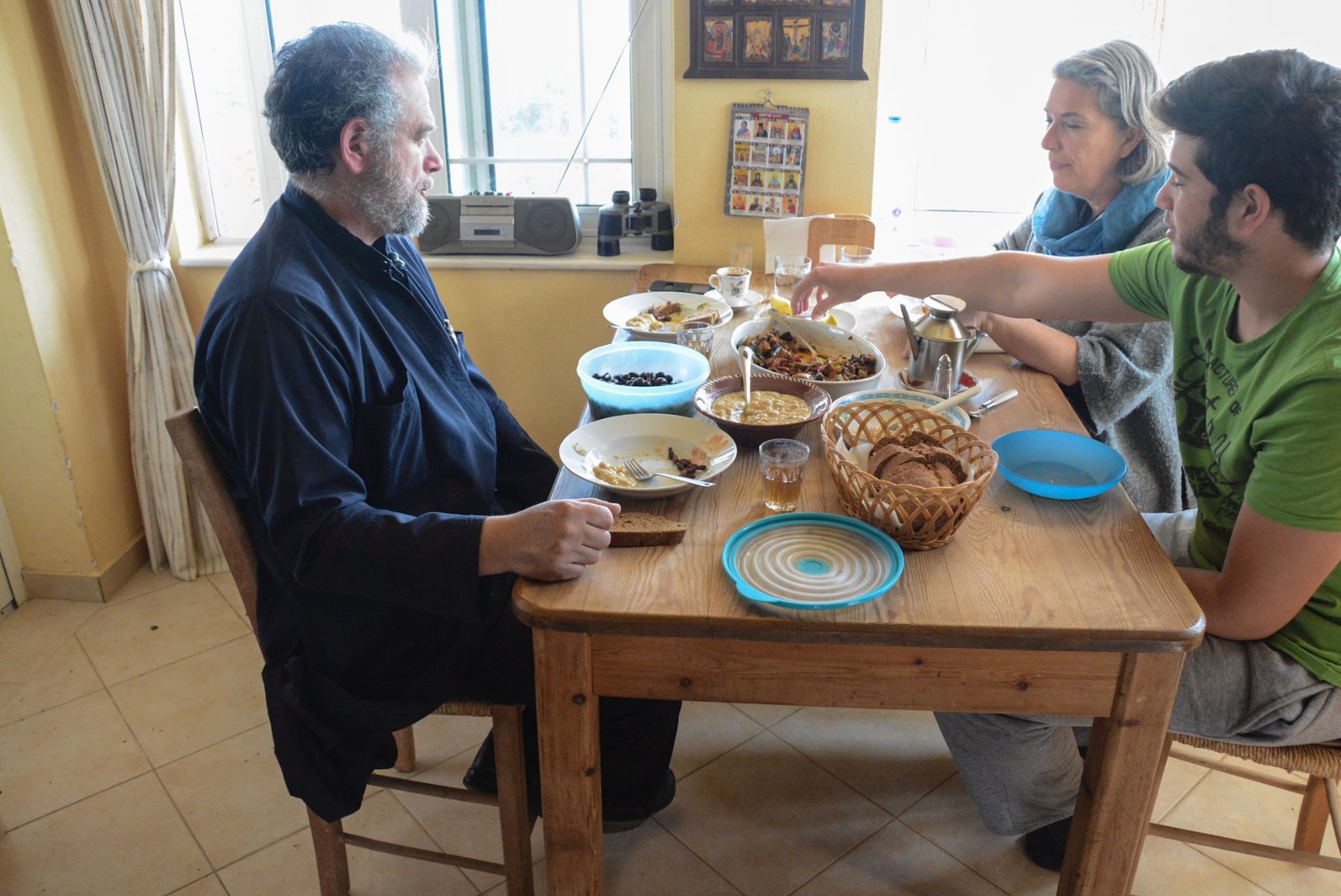 На Крите начало марта, весна. Я поехал на рыбалку, на южный берег Крита в район Франгокастело. Погода для рыбалки была хорошая, море прозрачное(даже слишком), вода 15 градусов, правда с северного побережья добирался неприятный, кусающий северо-восточный ветерок. У каждого рыбака всегда есть какой-то план по рыбалке, был он и у меня... И тут смотрю с горы спускается к морю, бородатый, сердитый грек. Откуда он шел непонятно. Я ему с улыбкой сказал “Ясу филе”(привет друг) он улыбнулся и завязался разговор. Так я познакомился с отцом Спиросом. Ему 50 лет и он священник в небольшой церкви Св. Николая, она почти на берегу моря. В молодости он увлекался подводной охотой, когда умер его отец, он стал священником. Спирос подсказал мне хорошие места для рыбалки и пригласил к себе в гости, когда я закончу рыбалку. Я с удовольствием принял его предложение. Подводная охота у меня не получилась, хотя планы были большие.. - найти большого лангуста и посмотреть новые места. Оказавшись в воде, понял что мои планы скорее всего не осуществляться. Видимость была слишком хорошей, больше 10 метров, рыбы почти не было, даже рыбы-попугаи, только завидев меня, быстро уплывали, не оглядываясь. Нырялось тяжело (ещё не прошел кашель, почти месяц болел). В итоге, за два часа поймал одну небольшую рыбку и хорошая кефаль ушла с гарпуна. Когда вышел на берег, Спирос ещё был в воде... он плавал 4 часа и взял большого группера и ещё одну рыбу. мы собрали снаряжение и пошли к нему домой, где Спирос рассказал о себе, как он раньше занимался подводной охотой, показывал альбом с трофеями. Охотился он больше 20 лет, было время когда он жил, только за счет рыбалки. Дом у него был в горах, где даже не было электричества, только подводная охота. Рассказывает, что бывало и 15 дней подряд охотился, ныряя на 20-25 метров. Основные трофеи -это групперы и саргос, говорит раньше они были крупнее и их было больше. Иногда выходил на берег, когда совсем зараста ходил подстригаться, так у парикмахеров ножницы сразу тупились и ломались, его волосы от соли были, как проволока. Отец Спирос - священник. Спирос из многодетной семьи, у него четыре сестры и три брата. Когда умер отец, он тоже решил стать священником. У него два сына, в доме я общался с одним из них, его зовут Андреас, ему 17 лет, помимо греческого, неплохо говорит по-английски и по-немецки. Ему нравится свобода, любит море, плавает с маской и трубкой, сказал, что не хотел бы жить в большом городе. В этом районе, школа находиться в Хора Сфакион, он там и учится. Со своей женой Спирос познакомился 20 лет назад, когда она туристкой отдыхала на Крите. Как-то ей удалось пробить сердце морского волка. Её зовут Сабина, она из Германии, город Бремен, по профессии врач физиотерапевт и сейчас работает в Хора Сфакион. Они живут в частном доме с видом на море, прямо около церкви. Когда я зашел, в доме был порядок и чисто, сразу видно, хозяйка немка. Подсобного хозяйства у них большого нет, небольшой садик около дома и где-то есть около 50 оливковых деревьев для масла и для соления. Пока Спирос переодевался, меня угостили кофе и Сабина накрыла на стол. Сейчас пост, у них в семье каждый постит по-своему, на столе было: бриам (овощное рагу с баклажаном и грибами), гороховая каша, оливки, хлеб. Это была пятница, какой-то определенный день поста, поэтому хозяин съел немного каши без масла и нескол