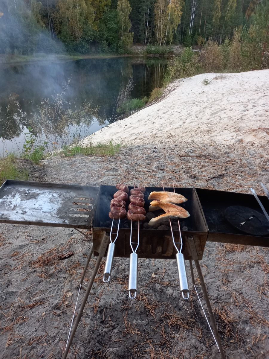 И тут я "завис",проходит полчаса,печь красная,кайфа нет,40 минут не то. Так привык к парогенерирующим печам,затопил и через 15минут,с Жига-3 через 8-10минут, уже на полоке лежишь не шелохнувшись,кайфуешь. С котелка снял крышку,вода кипит,в камни вниз перевёрнутой крышки от Жига-2,доп опция,ковшиком окуратно налил воды,она начинает парить и подыматся сквозь камни,тут всё,добился чего хотел,температура в районе верха окна 70-75,влажность не знаю,но кайф,прогрелись,напарились,накупались в Керженце. После бани Шикардос приготовил,мясных калбасок и пару стейко из рыбы,день прошёл замечательно,ещё одна начёвка в К7 с Дюна. Воскресенье в обед сборы,купание в реке,без бани и домой. Выходные прошли.