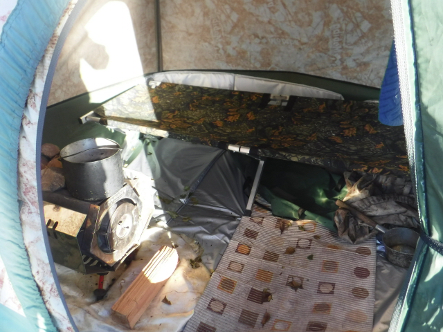 Очень доволен крайним приобретением - тёплый пол для подлёдной рыбалки. Купил на Авито за 2т.р. Не промокает, даже если льёшь на него воду. По углам петли для крепления. Складывается в сумку. Размер 240х240. Если в К5 и десятке его надо подгибать, то в пятнашке с учётом подогнутой вовнутрь юбки внутреннего тента встаёт как родной.