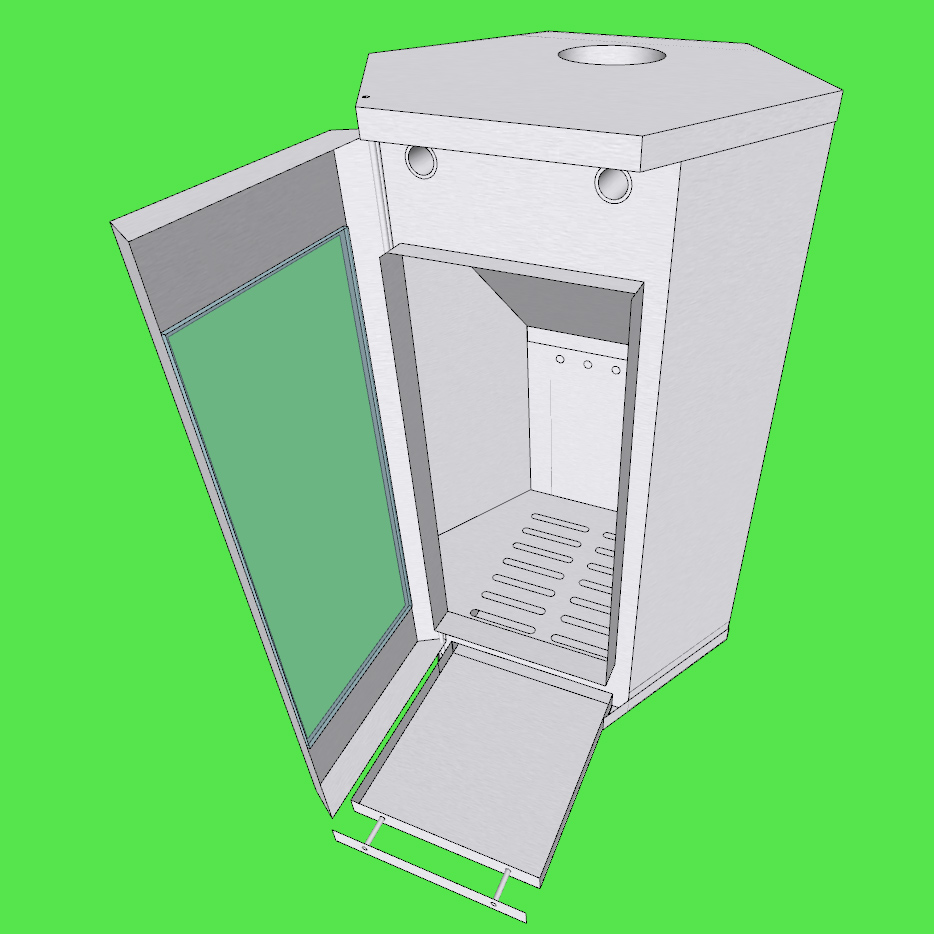 Не помню где тут обсуждалась печь со стеклом(каминного типа), просто оставлю это здесь. Моё видение подобного изделия в формате "Вертикальная Согра". Задний конвектор работает на подогрев воздуха для подового горения(через отверстия в задней стенке топки) и для обдува стекла(через трубы).