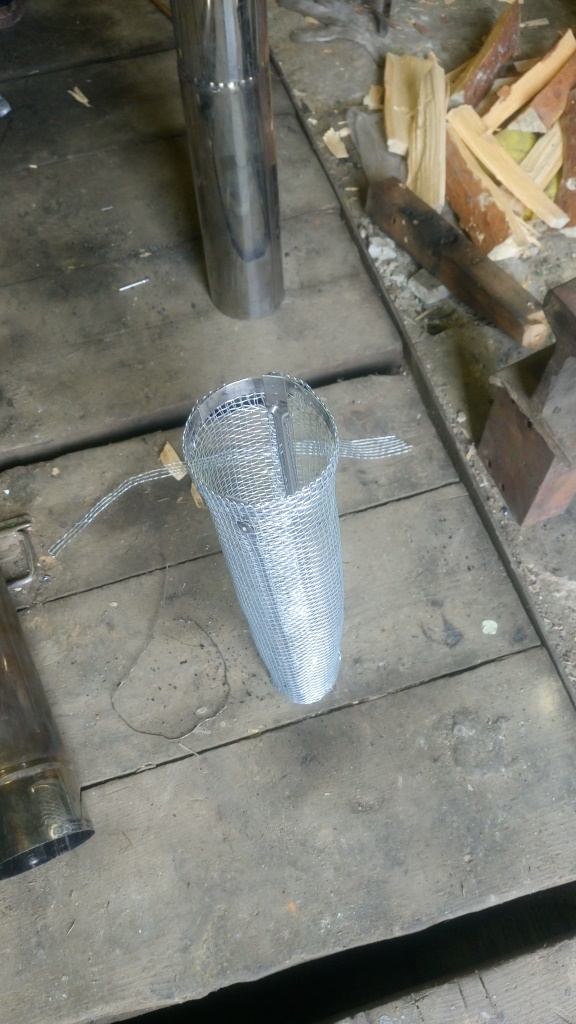Немного дофэншуил сеточку. Но это еще не окончательно. Промахнулся. Сделал маловатый заход на трубу. В принципе держится, но надо увеличить. Каркасик сделал из найденных в гараже, дешевых шампуров. Размер такой, чтоб влезала в стандартный 90мм сегмент дымохода. По длине - как сегмент. Примерка на дымоход Жиги На законном месте, На КЦ-2 А вот дальше дикие эксперименты.