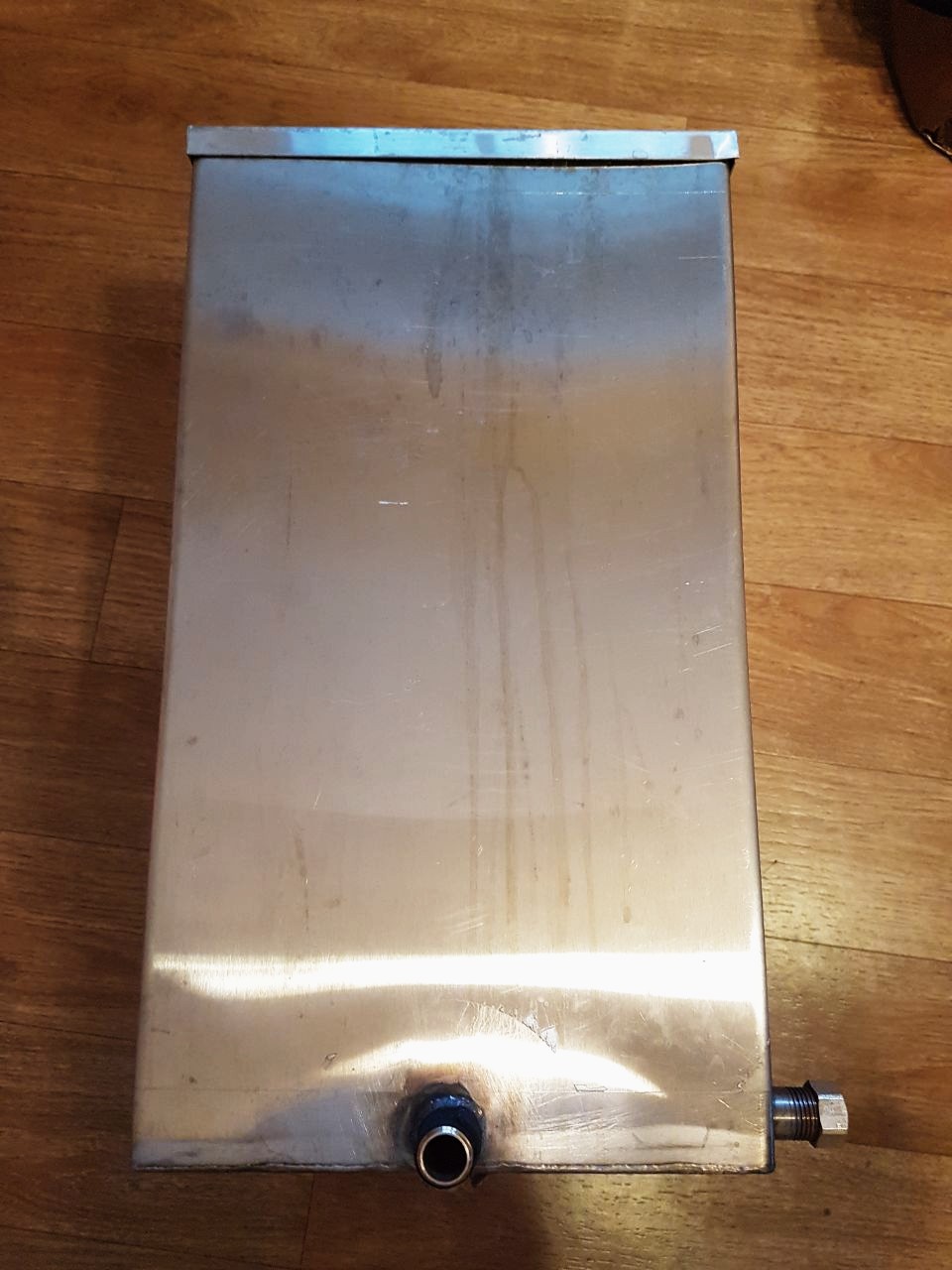 Приветствую всех Гвардейцев! Вот в своё время мне сделали под заказ, бак для воды примерно на 50 литров, пользовался один раз, теперь вот лежит без дела.На диаметр труб 90. Из нержавейки 1 мм, возможность установки крана в двух положениях.Прокладки в кране из паронита, не прогорят если воды не будет .ширина 25 , глубина 40 , высота 45 .