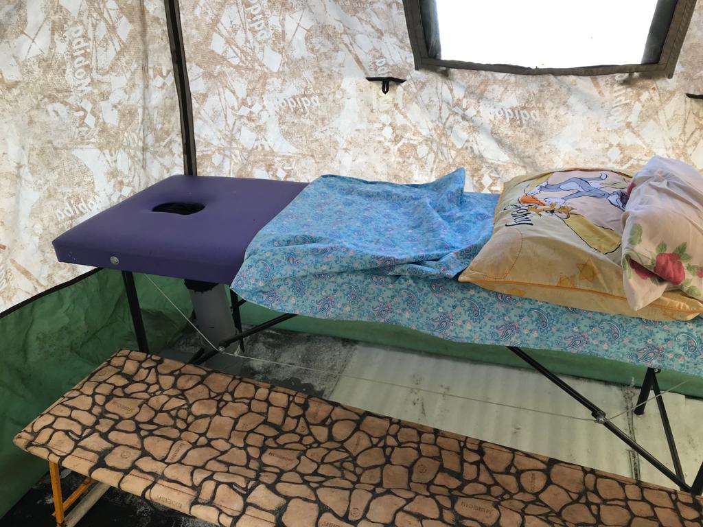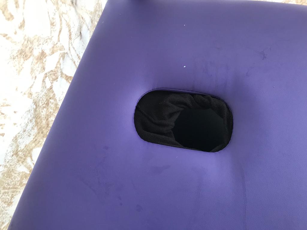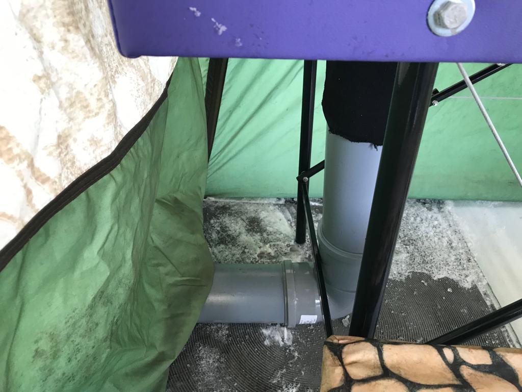 В итоге на сиреневеньком маркетплейсе был найден складной массажный стол с дырдочкой под морду лица, на двух тросиках и высотой 700 мм. Благодаря незамкнутому каркасу МБ-15 предельно просто сделать складку на юбке, в которую просунуть 110 канализационную трубу и через уголок вывести ее к дырдочке на этом столе.