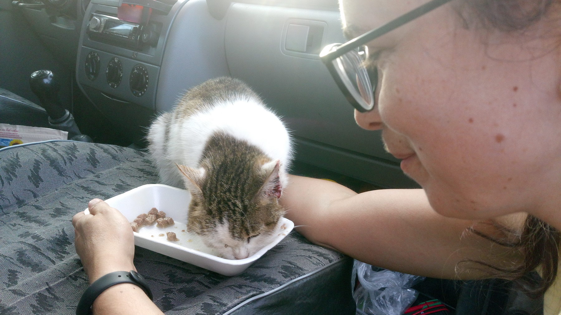 Наличие домашней живности в количестве двух кошек ограничивало нашу мобильность, ибо оставить их не с кем, поэтому мы просто взяли их с собой. Старшая морда (белая) уже привычная путешественница, ездит с нами не в первый раз, а вот младшую наглую рыжую взяли впервые, вот она: 354