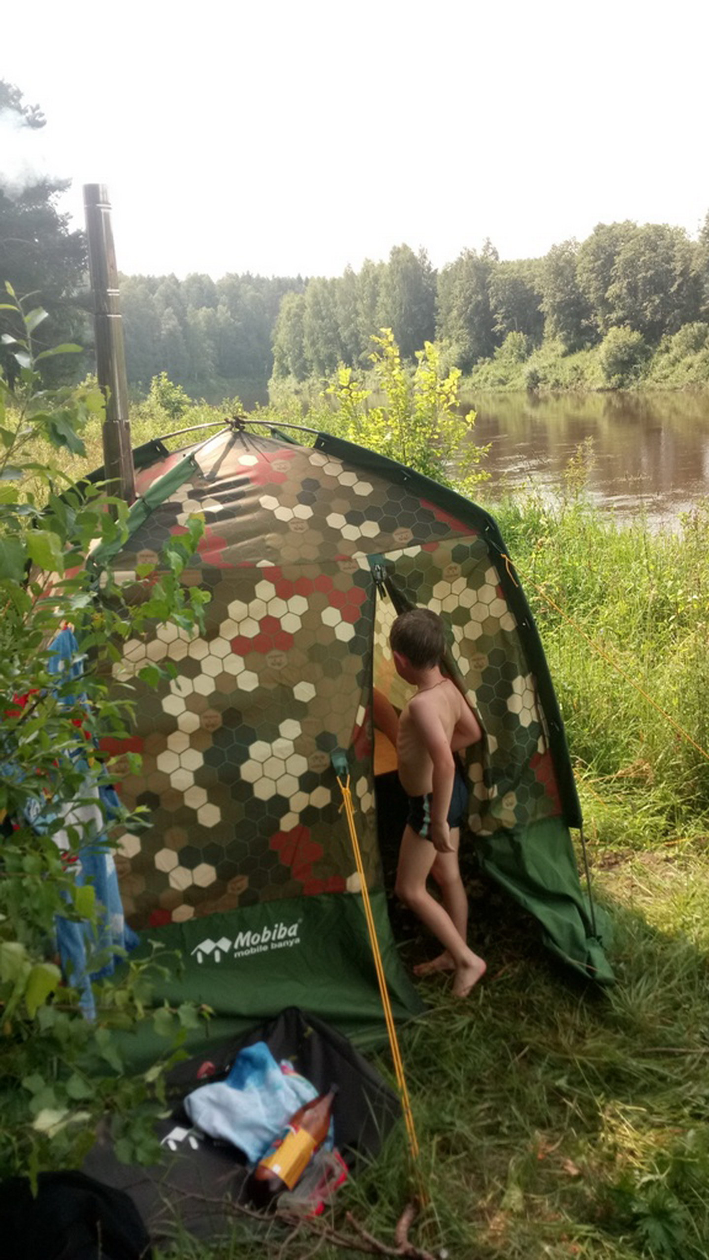 Я помню, как в прошлом году мы поехали семьей в обычной палатке и без теплых вещей (не ожидали как-то холода у реки посреди дневной жары в +35 и лично я реально мерз всю ночь, пока не догадался листом пенофола укутаться. Пить было нельзя, я за рулем, да и не любитель я пить. Поэтому в этом году детей мы приютили с радостью. Места хватило с запасом - половина палатки еще была свободной )) Поскольку это был всего лишь второй раз, когда мы ночевали в Мобибе и с Согрой я еще не разобрался: то жар, то прогорело все - пока не догадался хорошо растопить и оставить лишь маленькую щелочку в крутилке поддувала.