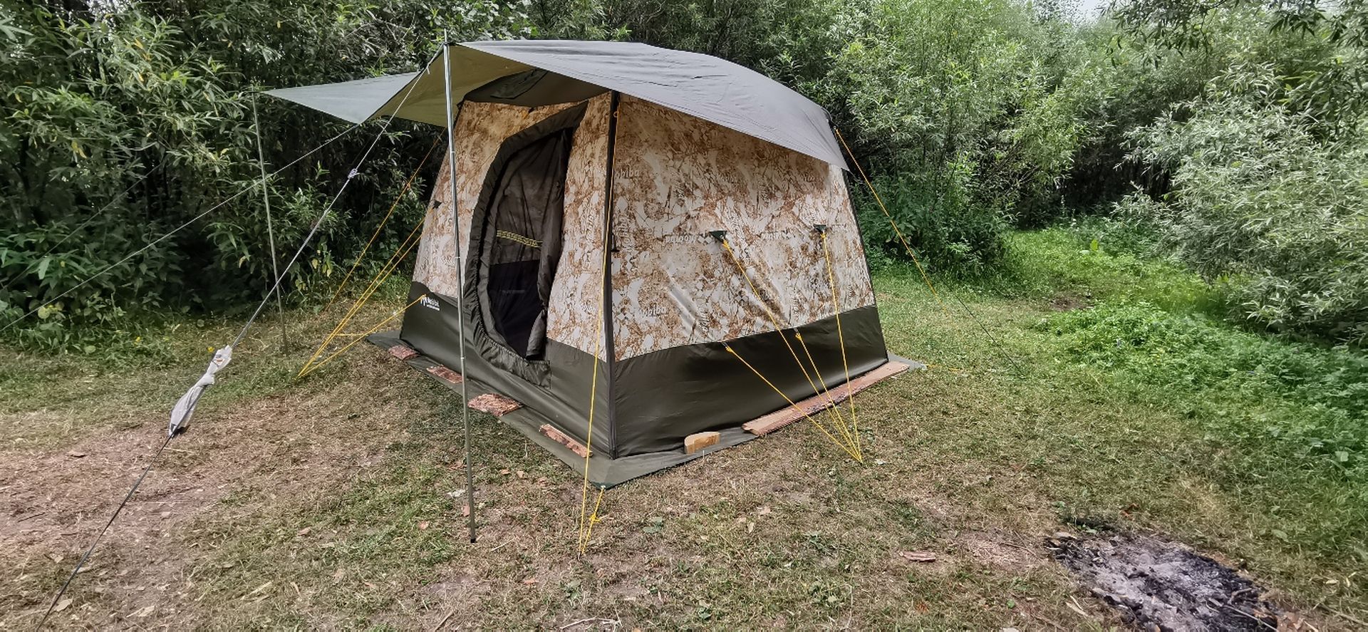 Вооо,затекает в палатку, при открывании двери. из-хз аа дождей не успел сфоткать, что тоже так делаю навес над К6. И ничего уже не затекает, при открывании двери.Бигстеп писал(а):А еще я бы предложил делать изн с небольшим метровым или полутора метровым козырьком над входом, чтобы дождь в дверь не затекал. Стойки можно из подручных материалов на месте сделать, либо вообще без них.