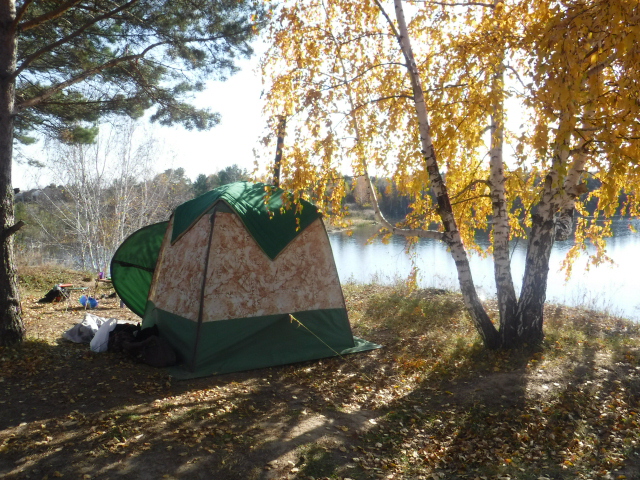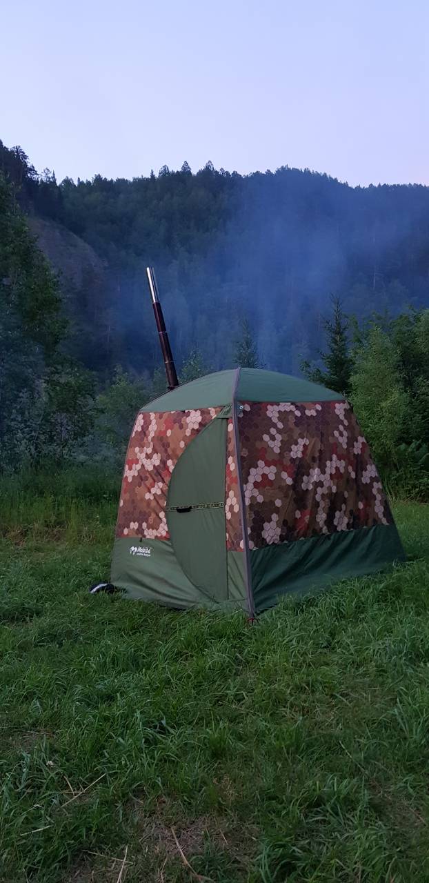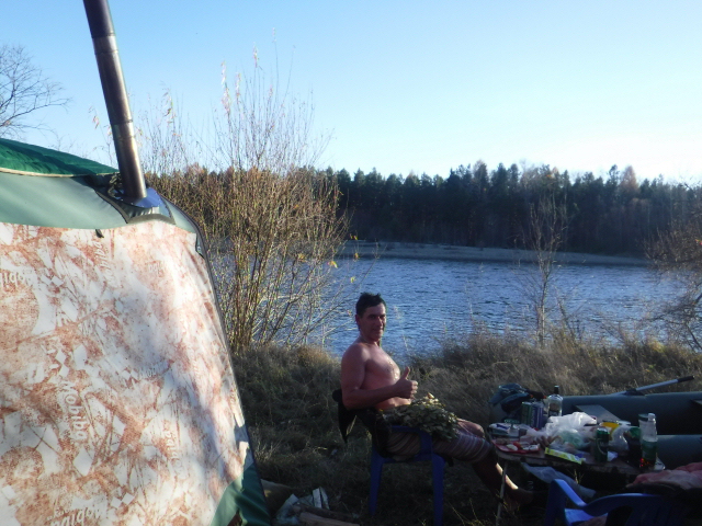 Золотая осень закончилась, на носу Покров. Очередная вылазка на реку с Мобибой. Поехали вдвоём, поэтому ограничились десяткой. Согра что-то у меня в этом году разошлась и даже в октябре сделала нам баню. На момент парения на улице было +4..+7, в парилке под потолком 80..85 градусов. Десятку укрывал стёганым ватним одеялом, а пол застелил квадратами-пенкой, ну и камень жадеит повышает банные кондиции. Дрова - сухая смолистая сосна. Труба наклонена, т.к. Согра стоит вплотную к стене палатки.