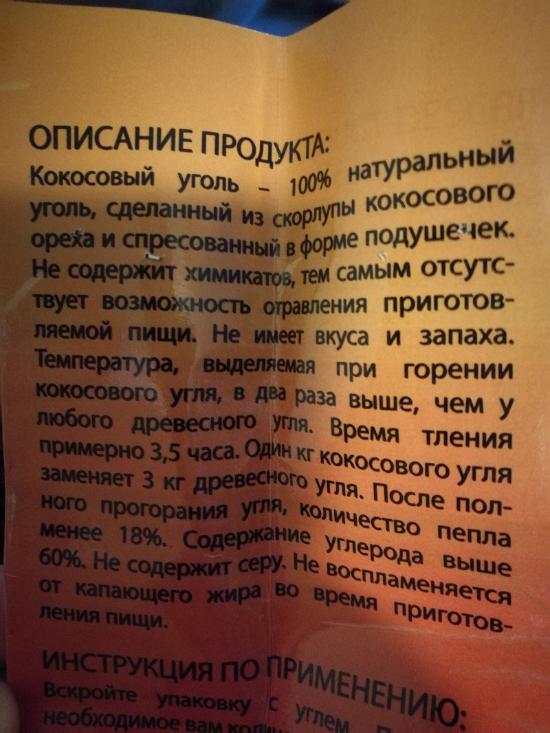 Значит так. Приобрел на пробу, исключительно в научно-познавательных целях, пакет КОКОСОВЫХ угольных брикетов. Почему исключительно в научно-познавательных? Дороговато. Пакет 2 кг стоит у нас 222 рубля. Это, насколько я понял, примерно 20 кг древесных брикетов типа руфов, и я очень сомневаюсь, что 2 кг даже самого-самого угольного угля заменят 20 кг брикетов.