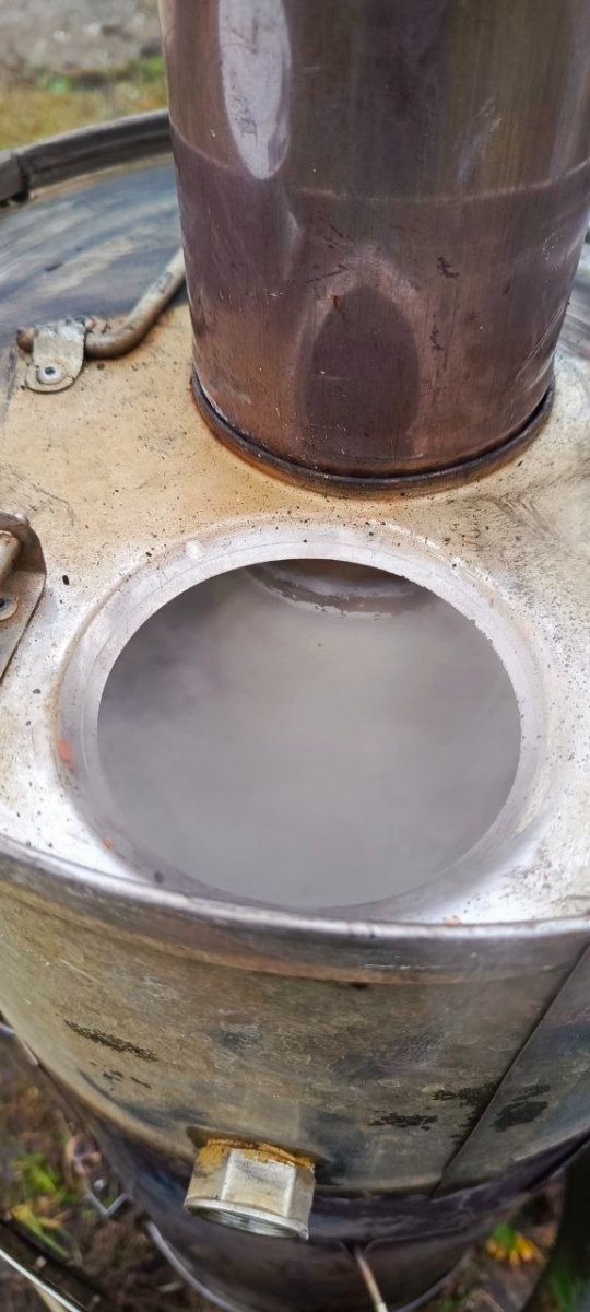 Вид сверху на пароперегеватель при снятом дымоходе. Видно есть нагар, мокрый, у нас дожди. Вроде и напяливал ведерко на трубу, все равно чуток натекает или конденсат.