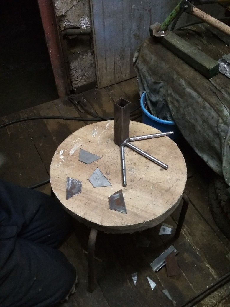 Жизнь кругом кипит и вертится! Предновогодняя суета... Вот и у меня сегодня новогодние посиделки отдельские. А по сему, вчера вечером, пришлось идти в гараж. Как то летом угостил сотрудников мясом, копченым в Шикардосе, вот они меня на него и развели!) Собрал мангальчик возле гаража, растопил. Пока суть да дело, решил покопаться в гараже. Ведь осталась еще нержавейка! А предыдущая хреновина для Жиги мне показалась не совсем оптимальной. Болгарка, молоток, тиски, сверло. Вот, что получилось