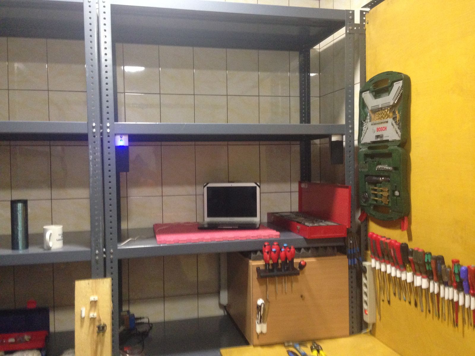 Так как верстак длинный, а инструмент и доп. освещение должно быть максимально рядом, выдвижение ящика с лампой и максимально полезным инструментом помогает.
