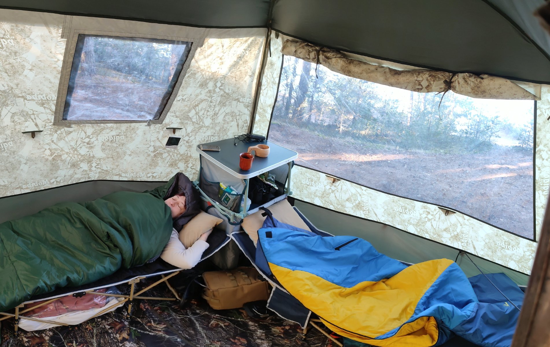 Классный выезд, стимулирующий других ехать срочно в лес с Мобибой. Отдельное спасибо за фото внутреннего пространства с расположением мебели. Я всегда хочу расставляю кровати таким же образом по стенам, и даже три штуки, но когда едем с женой, она заставляет меня делать из двух раскладушек большую двуспальную кровать. Большой надувной матрас, огромное толстенное верблюжье одеяло, как перина на него и спальник Мобиба сверху.