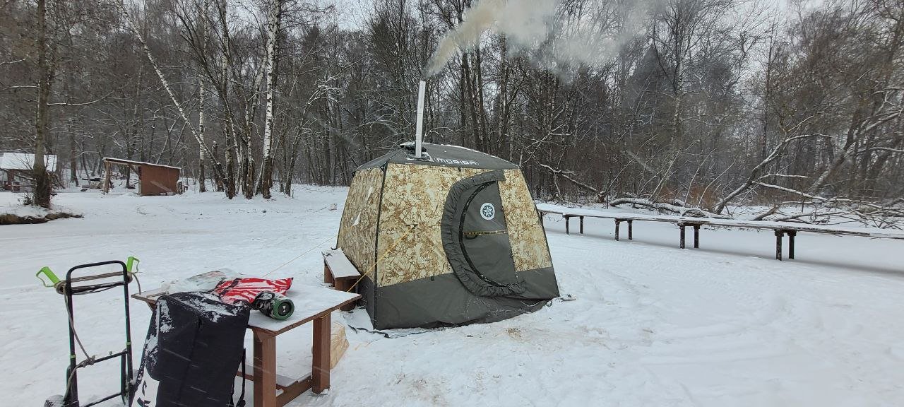 Из очевидных мне упущений - я не утеплял пол (ставил баню прямо на заснеженный/промороженный грунт) и не везде придавил "юбку" палатки (немного поддувало снизу периодически).