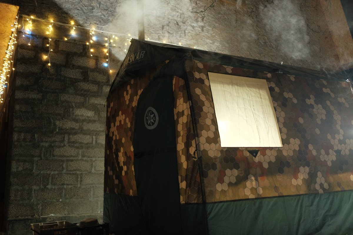 Поставили баню и переодевалку с теплообменником. Замачили веники в реке. Неуспели раздется- баня "сготовилась".