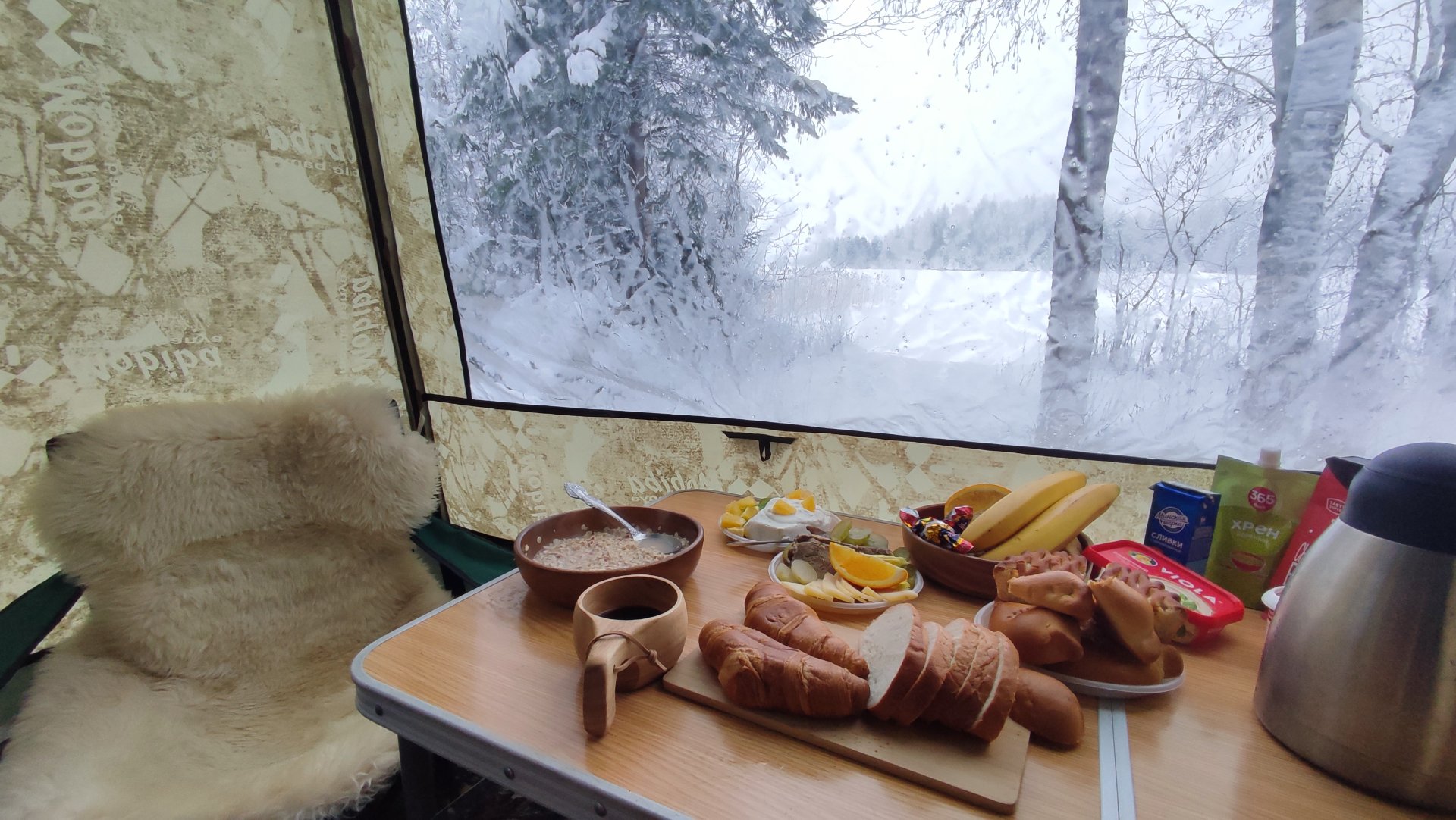 «Неоригинальная» печь-камин в целом за ночь справляется с задачей длительного горения, но пару раз вставал подбрасывал для уверенности. Утром кофе в турке на печи и неспешный завтрак. В окно наблюдаем как на озере начинают появляться рыбаки, и каждую лунку бурят все ближе и ближе к нашему берегу, им явно интересно что же тут за палаточный лагерь зимой образовался.