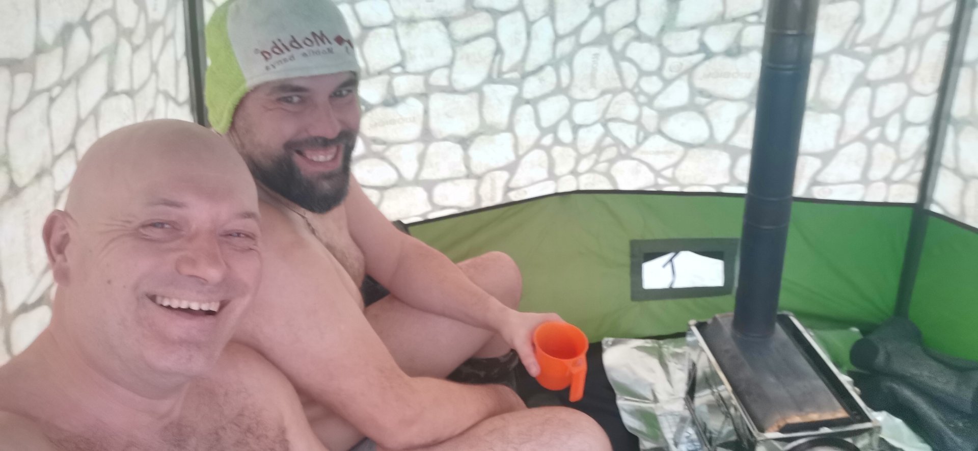 С собой на рыбалку взяли баню МБ-10 аквариум. Использовали как комнату отдыха в вечернее время, прятались там от комаров.