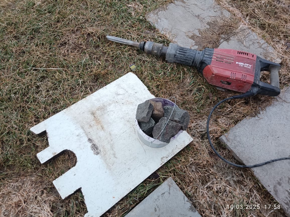 Тут в наследство достался вот такой перфоратор, расколол большие камни. Предварительная примерка, вошло 20 кг камней, понятно что укладывать буду более плотно и не сегодня ставить печь в баню, но просто не удержался.