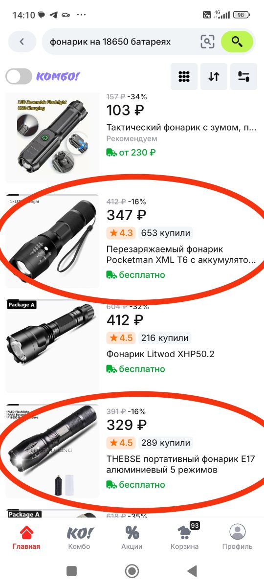 В пластиковую банку из под кефира/молока помещаю фонарик стоимостью около 350 руб. Просто набрал на Алиэкспрессе фонарики на батарейке 18650, заскринил первые попавшийся, если выставить по цене, можно найти дешевле. Обязательно с регулировкой ширины луча.