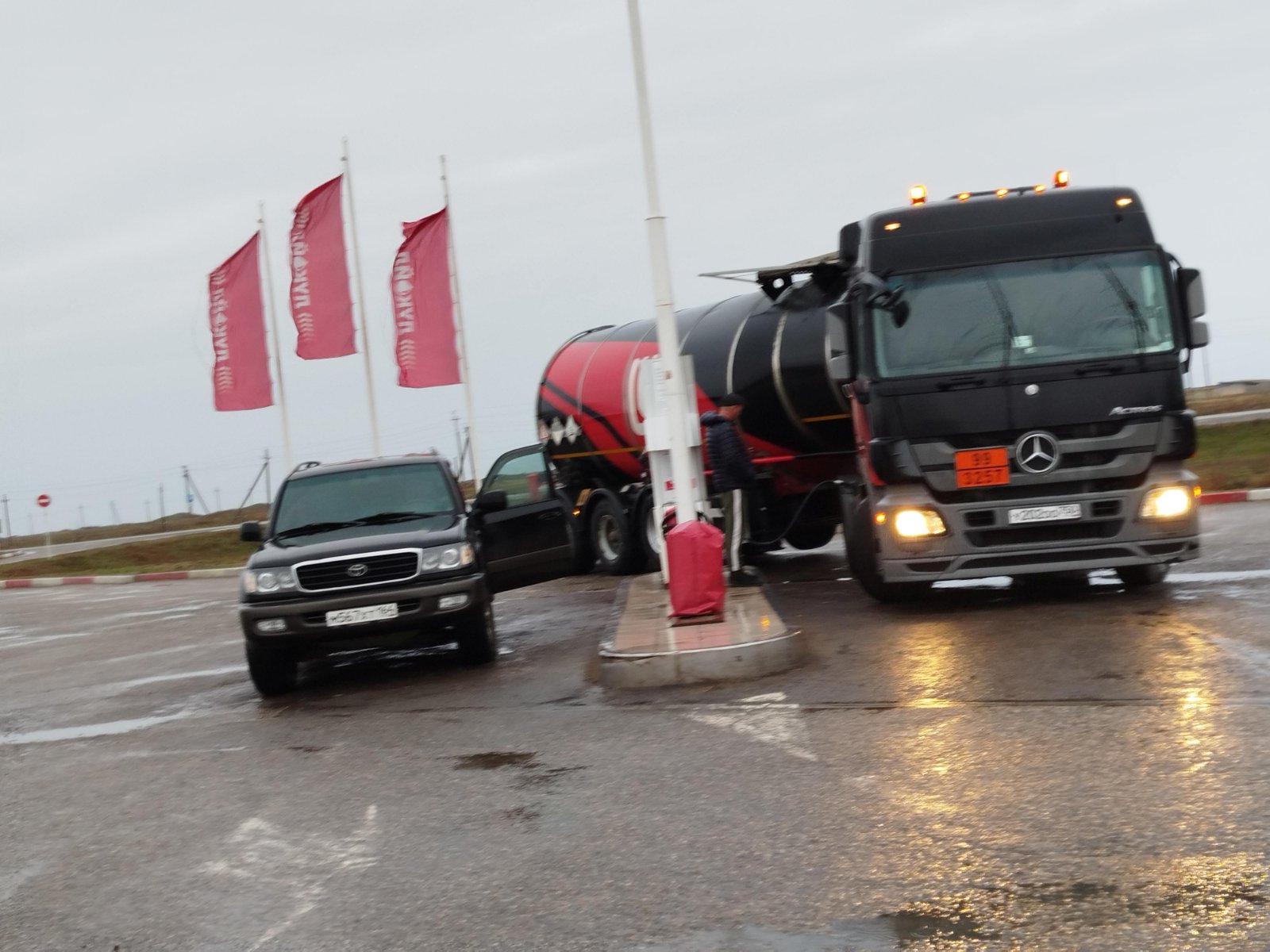 Где то под Волгоградом встретились на Лукойле с фурой которая привезла топливо на заправку и на этой же заправке заправлялась. Мы встали бок о бок. Эх и знатный вышел у нас разговор, я хотел видео снять но человек по понятным причинам отказался и разрешил сфоткать издали это дело.